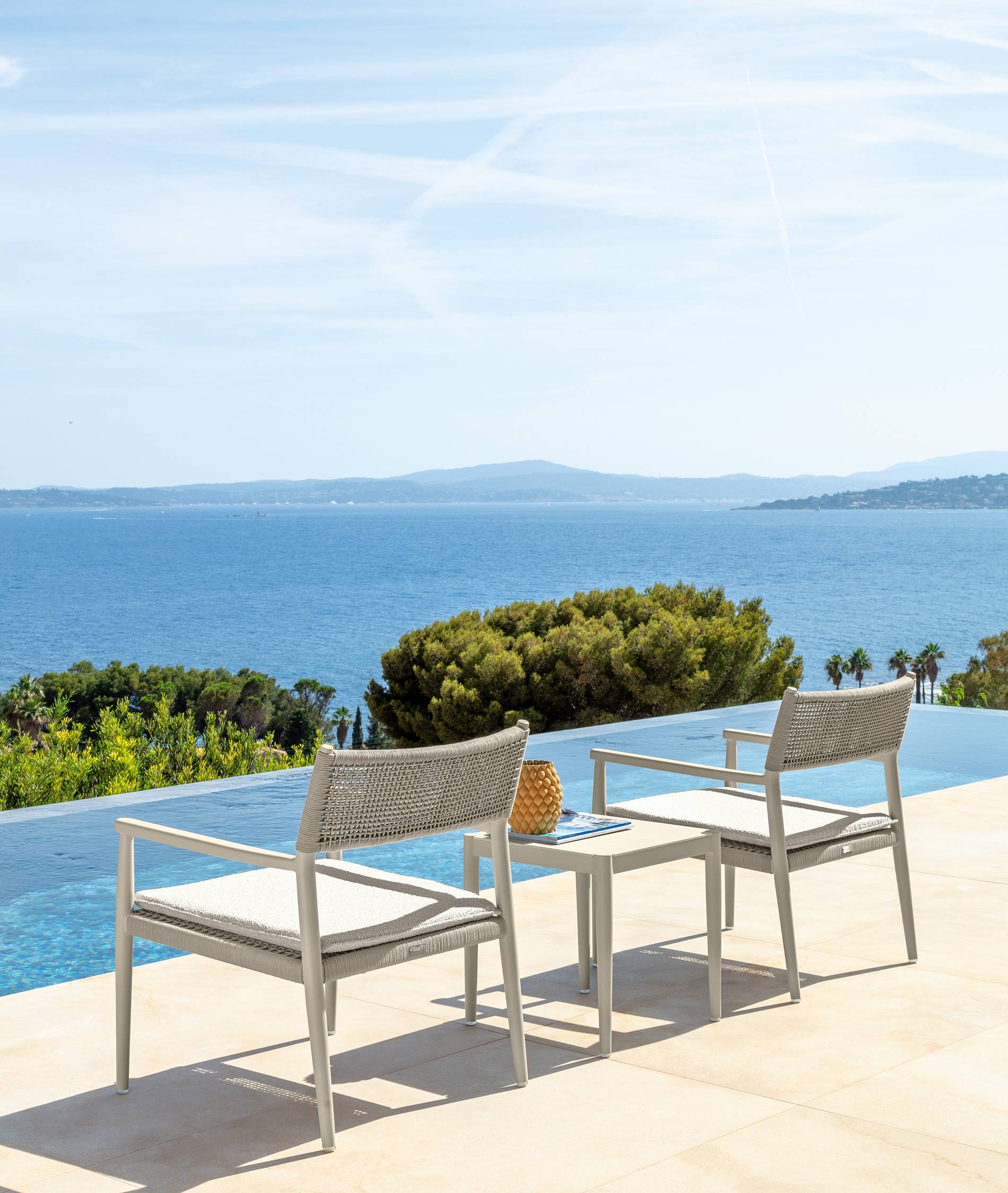 An aluminum frame gives the table its light character and confident structure. It’s a material chosen for outdoor life—clean-lined, steady, and unfazed by changing weather. The top is gres, a dense ceramic that stays flat, wipes down easily, and resists everyday wear. The pairing reads refined yet practical, with a surface that feels cool to the touch and a frame that keeps everything aligned.