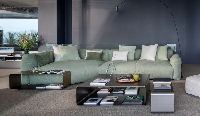 Designed with versatility in mind, the Foglio coffee tables come in various sizes and heights, allowing for seamless integration into any room layout. Their dimensions are carefully considered to create striking centerpiece compositions in the living room while also fitting perfectly between the elements of the Fiocco modular sofa. This placement not only breaks the continuity of the fabric but also adds a sense of movement and fluidity to larger arrangements, enhancing the overall ambiance of the space.
