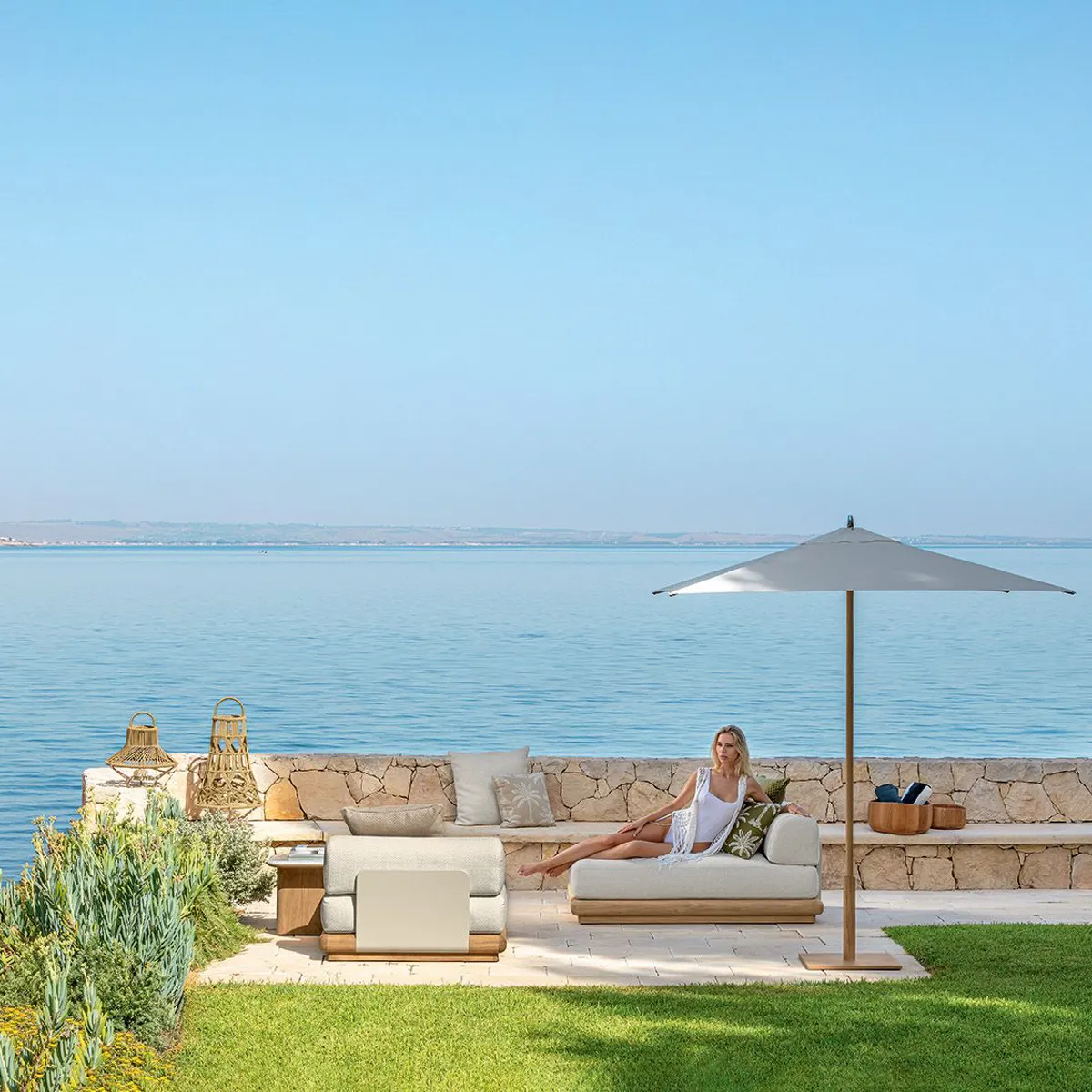 Materials, honed to purpose, lead the narrative. The base is crafted in Accoya, a high-performance, acetylated wood chosen for its dimensional stability and weather resistance. In outdoor furniture, that choice matters; in coastal settings, even more so. It looks warm and organic, yet it behaves with a technical rigor that suits year-round terraces and poolside lounges. Above, the top is offered in two distinctly Italian expressions of stone: elegant White Carrara marble or Travertino Titanio. Both are finely worked and beautifully finished—cool to the touch on a summer evening, quietly luxurious under a tray of glasses and a novel you meant to finish last year.