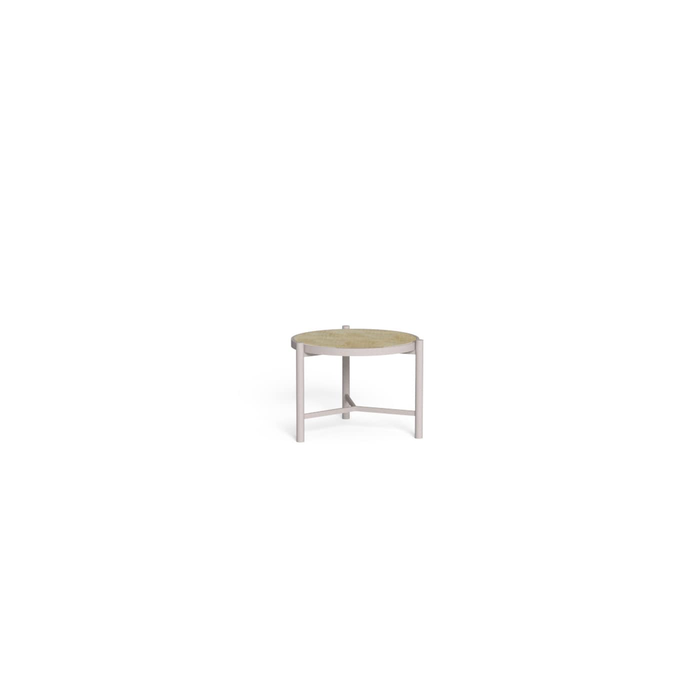 A powder-coated aluminum frame supports the top with reassuring precision. The metal keeps the structure lean without sacrificing stability, while the cross element ties the legs into a single, solid volume. On the surface, gres (porcelain stoneware) provides a refined, tactile plane that feels crisp to the touch and holds its line over time.
