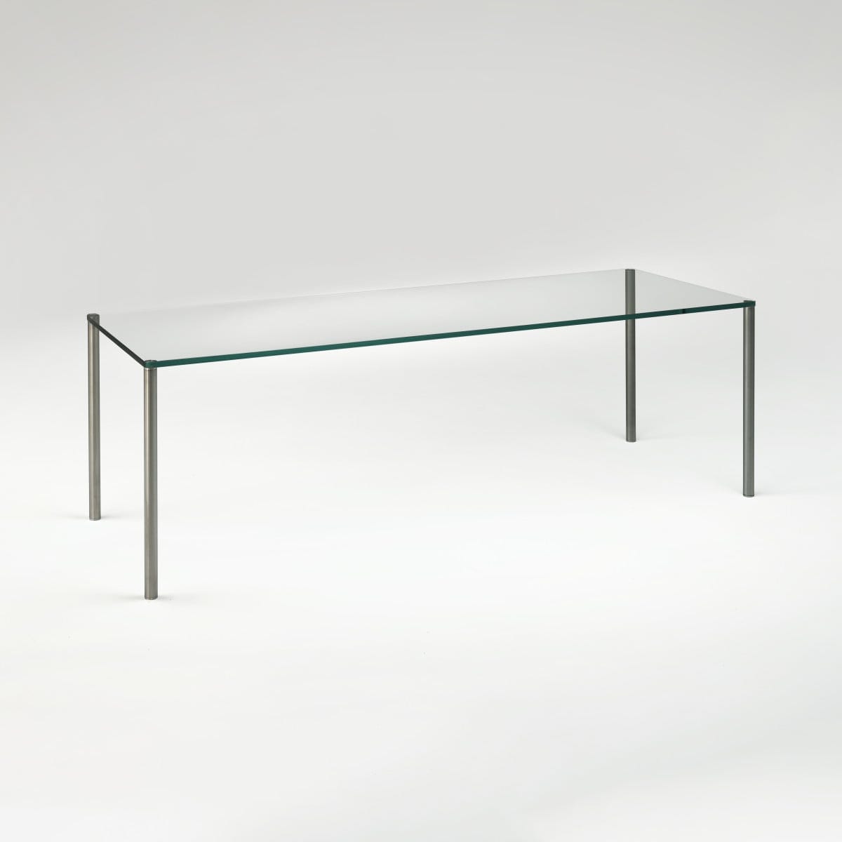 The proportions stay crisp across formats, from long rectangular tables to round and square options. The glass reads almost weightless, while the legs add just enough structure to keep the whole composition sharp and intentional.
