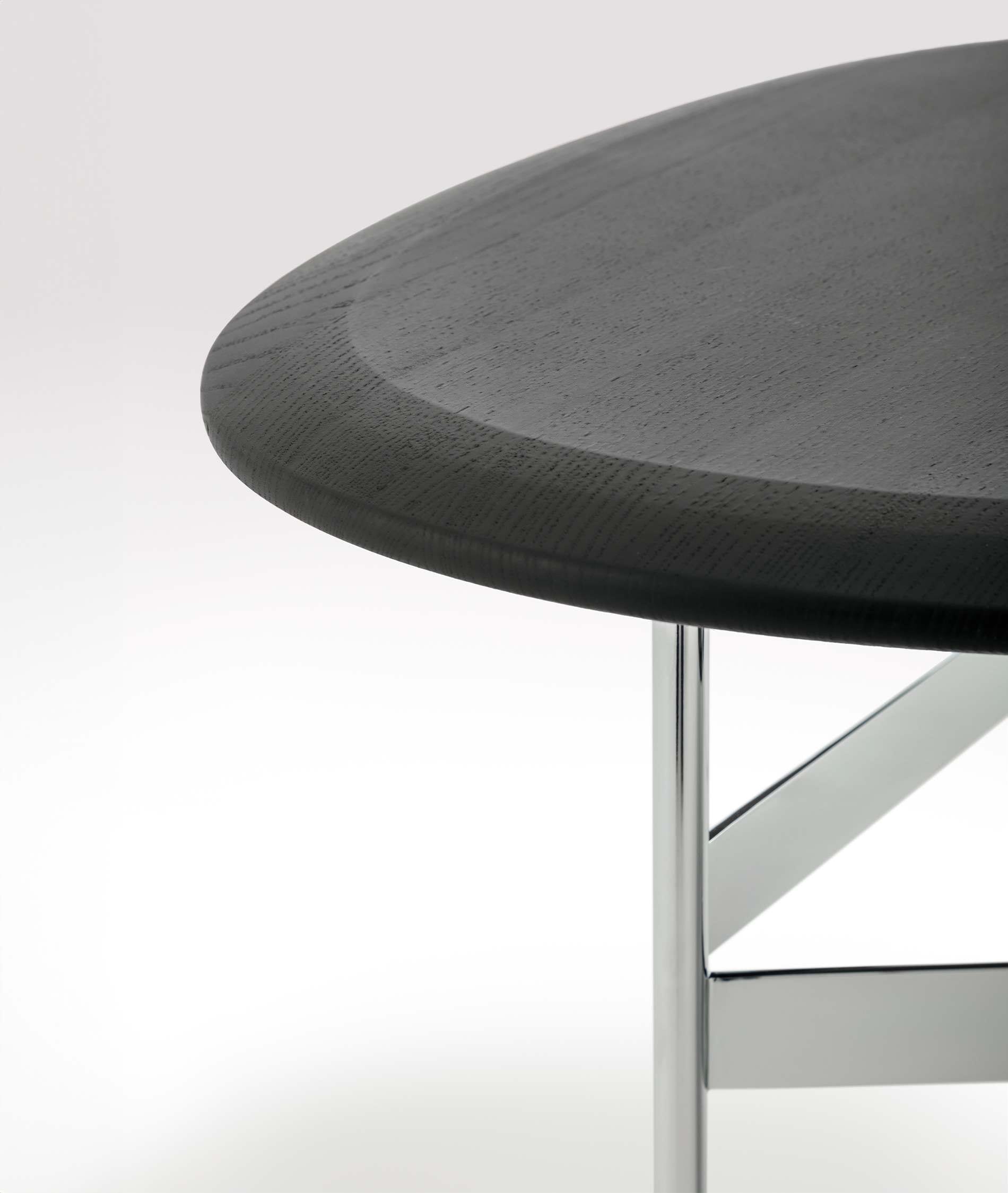 The legs are steel, offered in burnished, chrome, or glossy black. Thermoplastic polymer glides protect floors. Every combination feels intentional. There is no filler finish in the range.