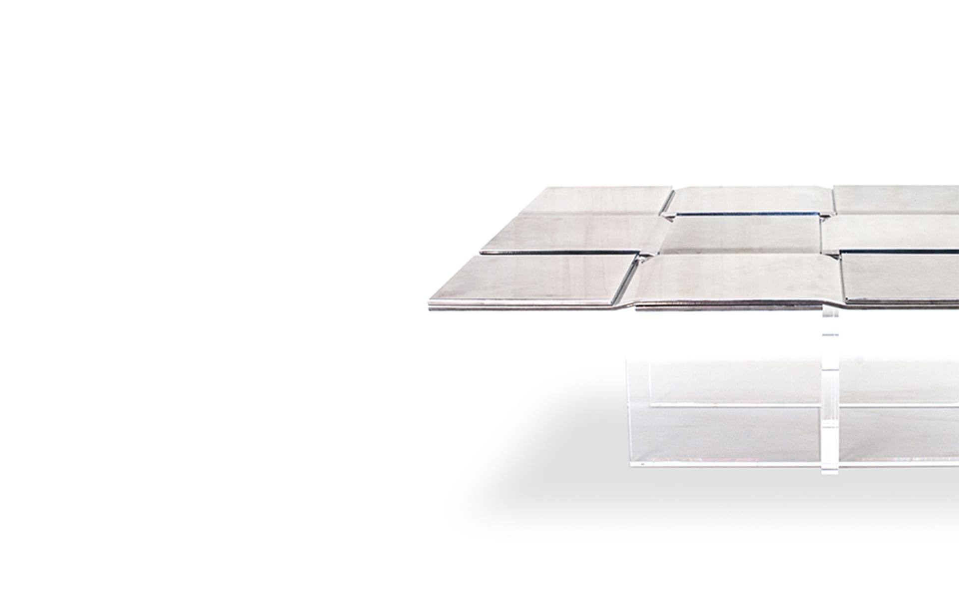 The top is made from lacquered stainless steel, chosen for its polished presence and its practicality outdoors. The lacquer finish adds a smoother, more refined look while keeping the surface feeling composed. The acrylic legs keep the profile visually open, so the table reads lighter than its footprint.