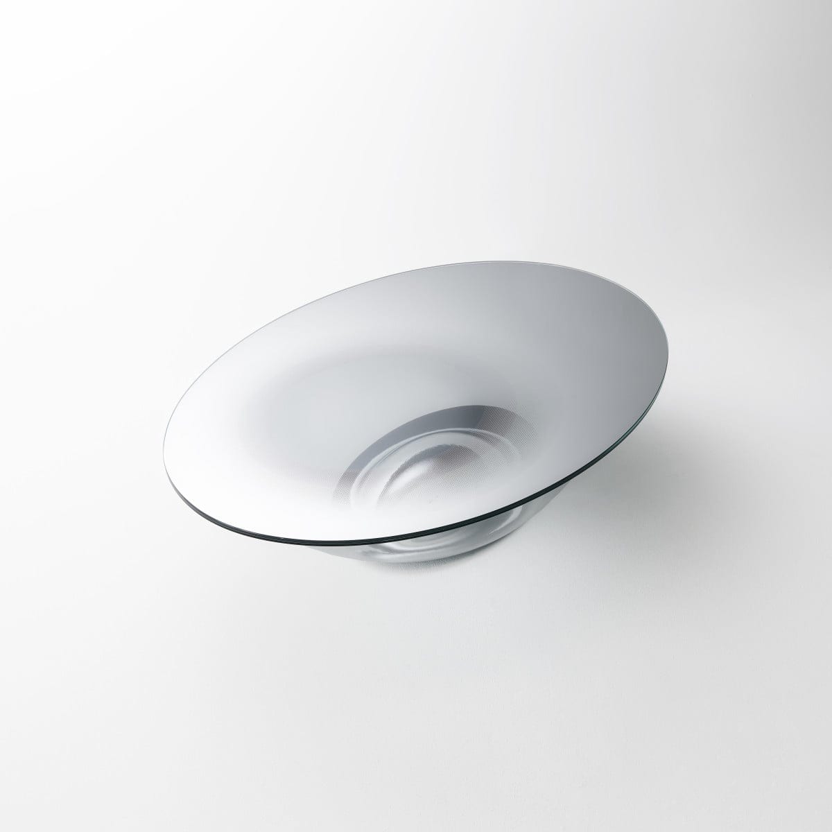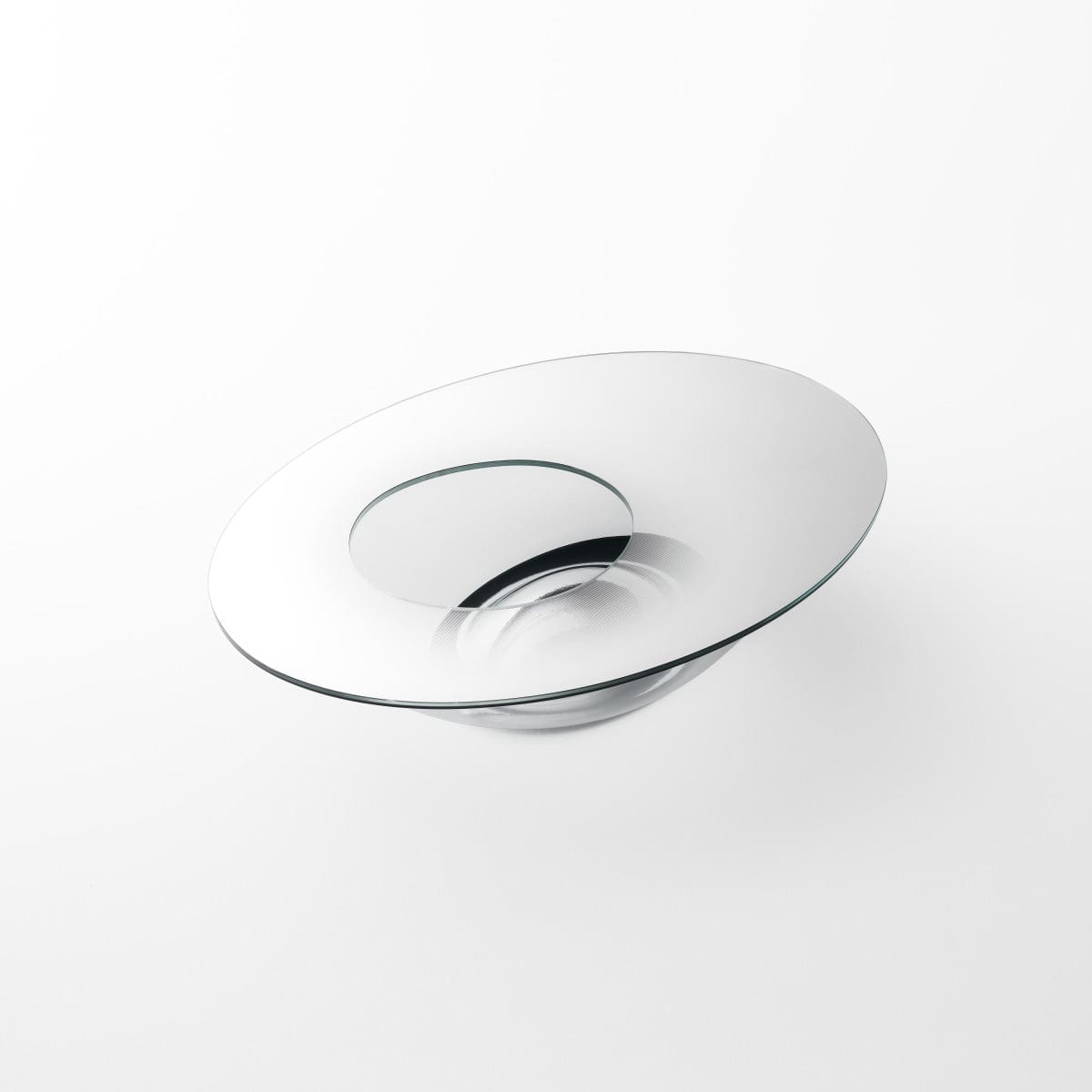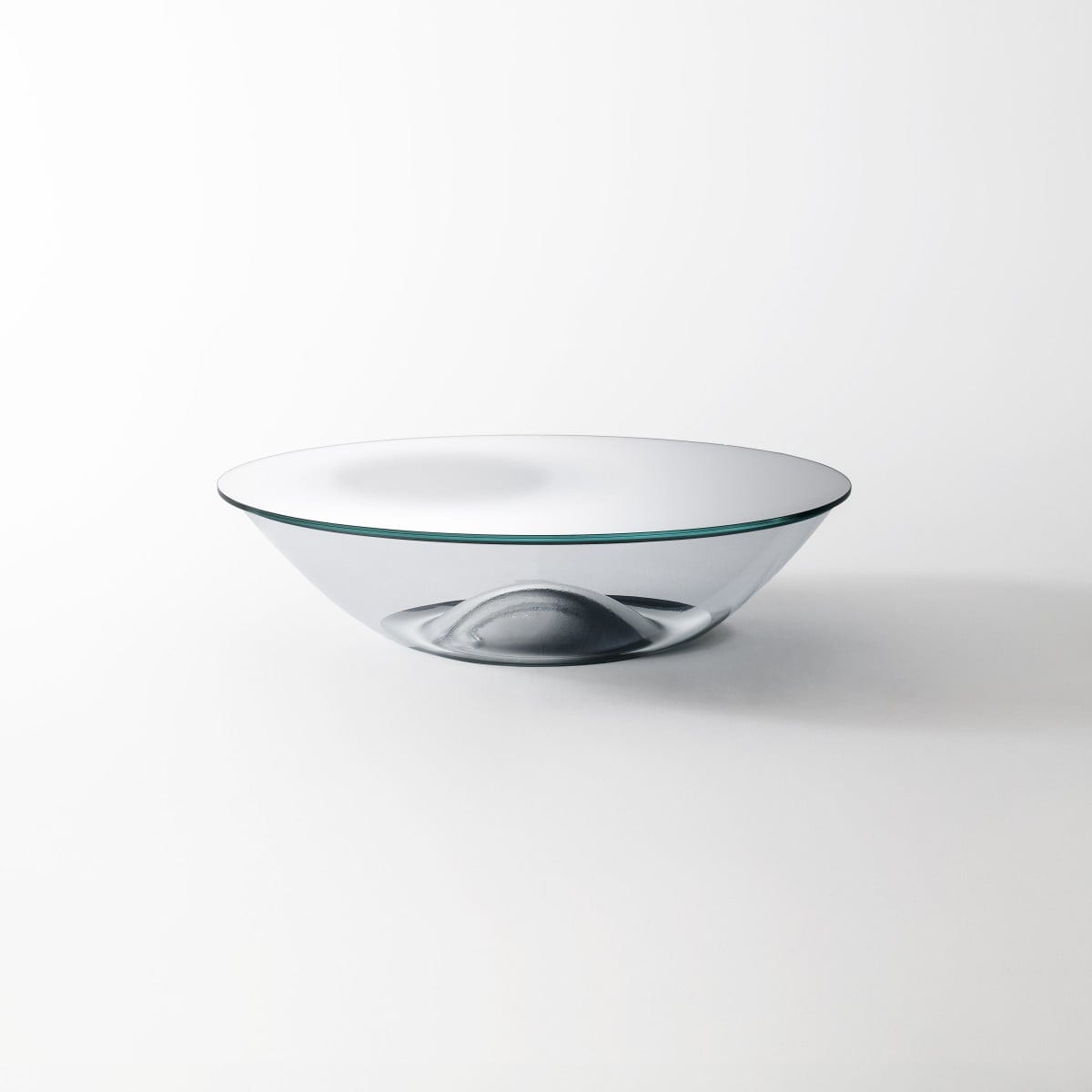 The base is made from transparent extra-light glass, formed from a flat 0.47-inch slab that is moulded through a complex heat treatment, then trimmed around the perimeter to define the final shape. Underneath, a mirrored bottom adds depth and shifts with the room’s light, but it still lets the glass read clean.
