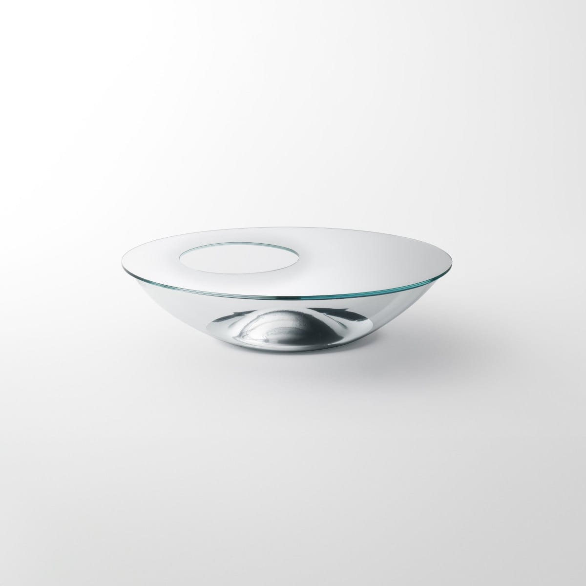 Designed by Yabu Pushelberg, the piece keeps its focus on proportion and surface. The transparent round area on the top is not a detail for detail’s sake; it’s the visual pause that lets the mirrored finish feel lighter.