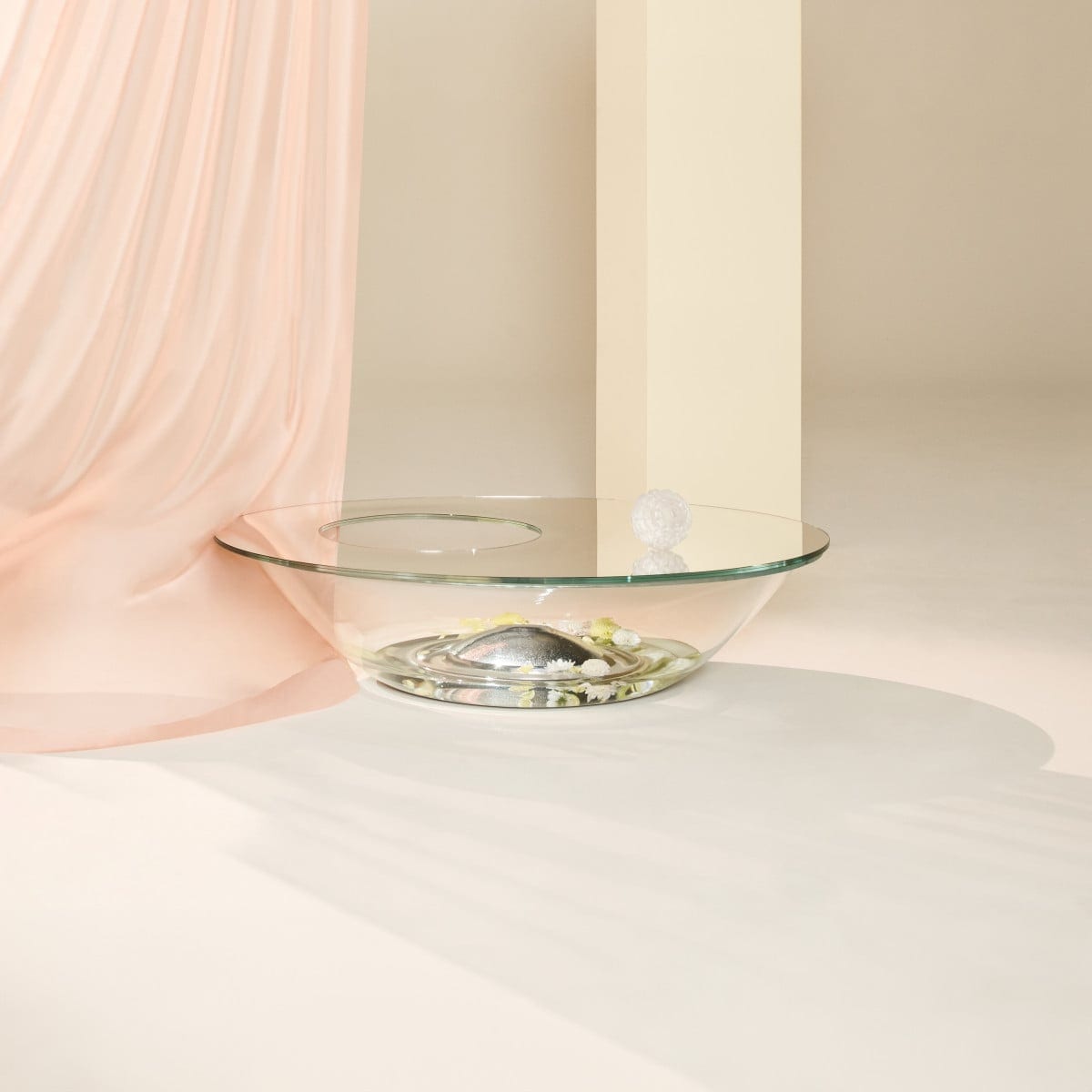 Nacre is a low table with a fluid profile, drawn from the organic curve of an oyster shell. The silhouette stays soft, but it reads precise. An oval glass basin forms the base, and the top sits over it with a subtle circular fade that pulls the eye inward. The result is quiet, sculpted, and a little unexpected without trying too hard.