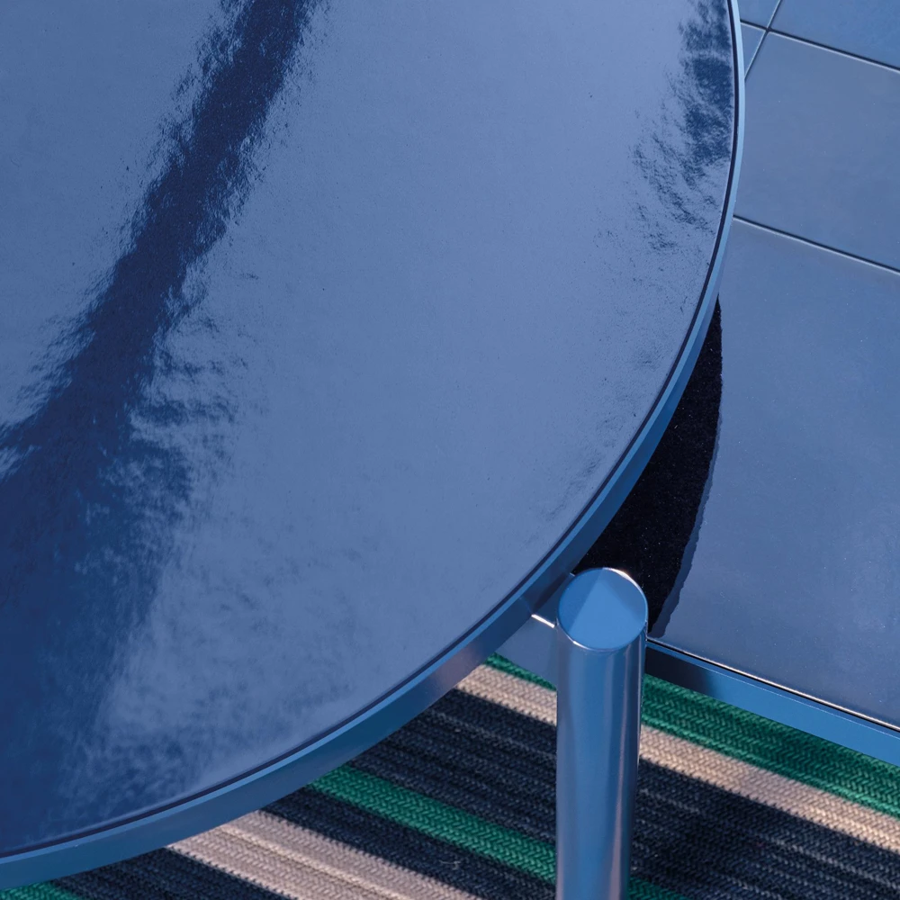 The tabletop is glazed stoneware arranged in an interlocking layout, creating depth without clutter. The glaze brings a soft sheen and a smooth hand, with tonal variations that keep the surface visually alive. Beneath, a painted aluminum structure provides the right mix of strength and lightness. The two materials meet cleanly, giving the table a crisp silhouette with no fuss.