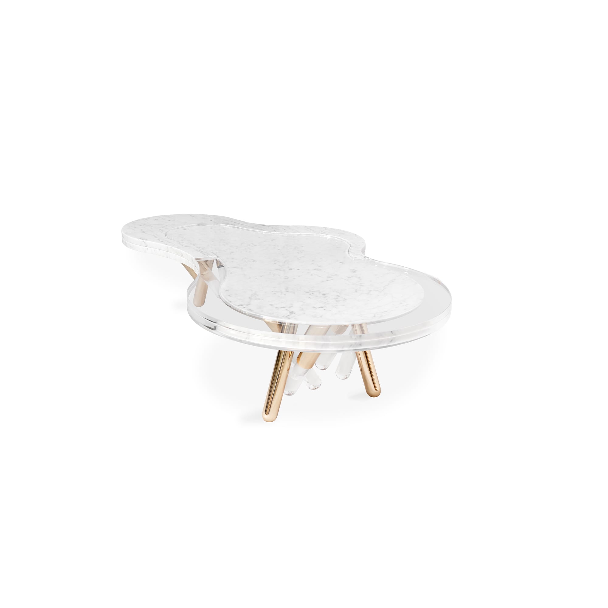 The standard version pairs a Marble I and acrylic top with legs in acrylic and plated stainless steel. Plated stainless steel details finish the piece with a subtle, polished note. The mix is intentional: transparent elements reduce visual bulk, and the stone does the grounding.