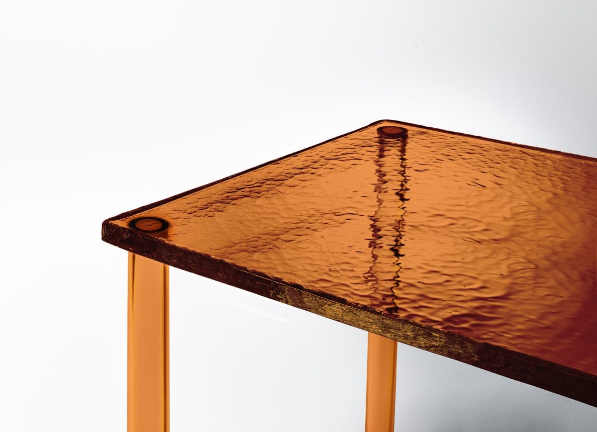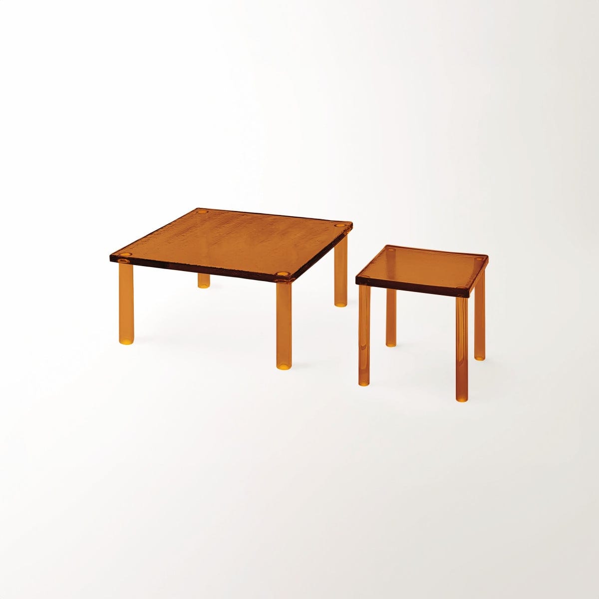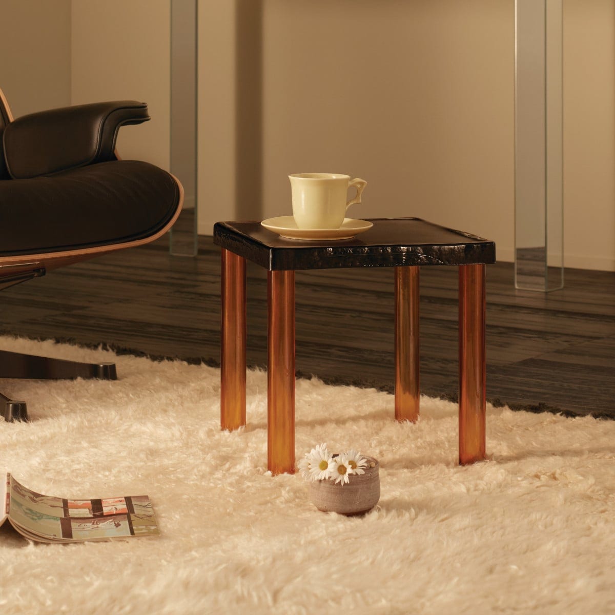 Nesting is a family of high and low tables designed by Ronan & Erwan Bouroullec. Each piece is defined by a square top and clean, cylindrical legs, all in Murano amber glass. The tone is warm without being loud, and it changes through the day as light moves across the surface. It reads minimal at first glance, but the thickness and depth make it feel substantial.
