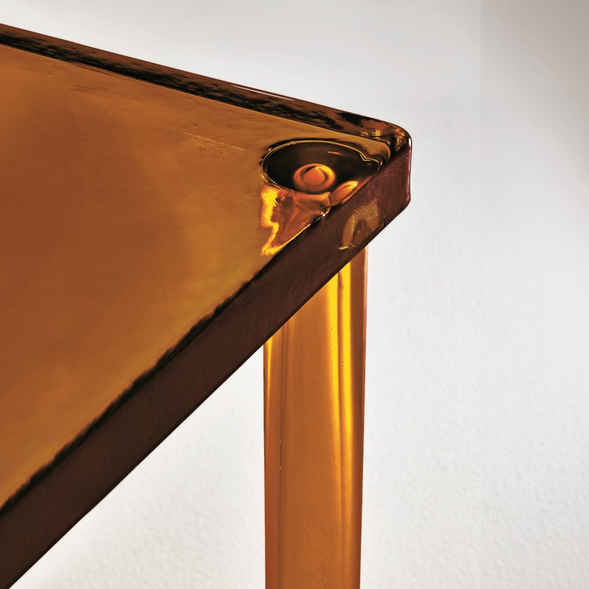 Every table is made entirely from Murano amber glass, chosen for its uncommon strength and plasticity. The tops are formed from extremely thick poured glass, giving the square surface a bold edge and a rich internal glow. The legs are blown glass, cylindrical and precise, with the kind of consistency that only comes from real control of the process.