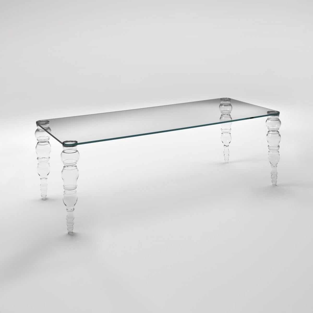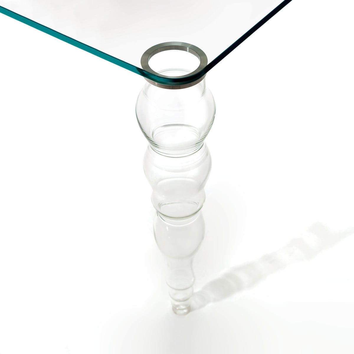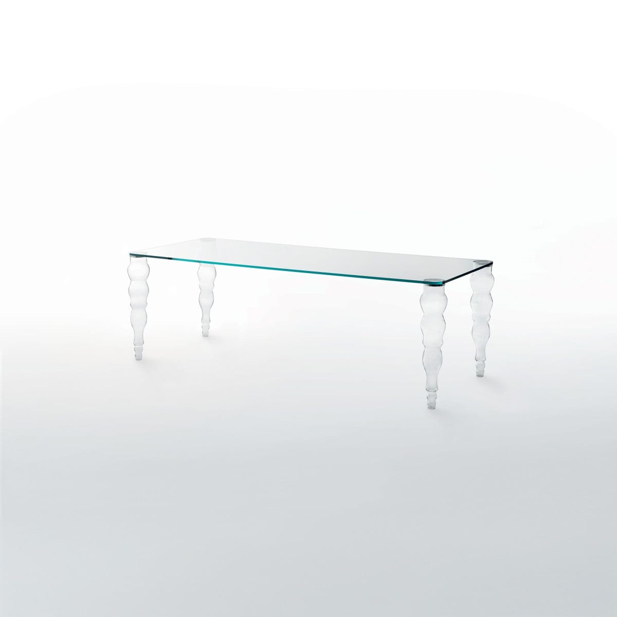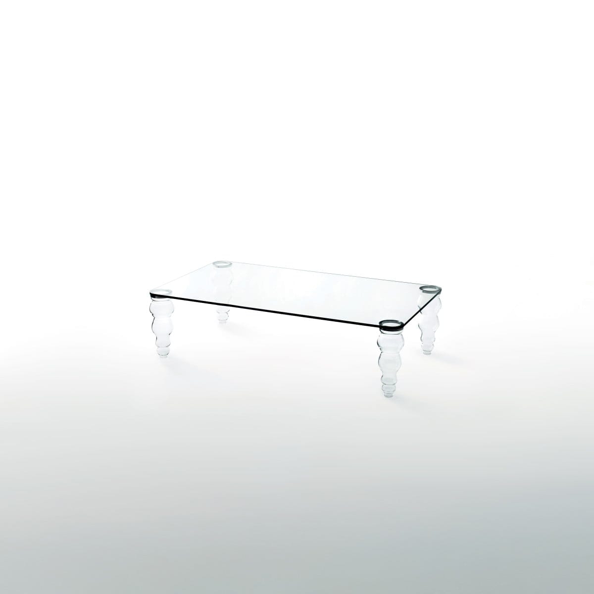 The top is offered in transparent glass, transparent extralight glass, or glossy lacquered glass. Each finish changes the mood: standard transparent keeps it straightforward, extralight looks cleaner and less tinted, and glossy lacquered brings a more saturated, reflective surface. The feet are molded and shaped borosilicate glass, giving the base a distinct presence without visual heaviness.
