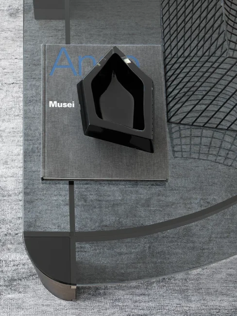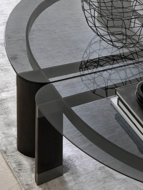 The structure of Quartetto Small Tables is crafted from burnished metal, offering durability while maintaining a sleek aesthetic. The legs, available in coffee-brown or black-stained ash heartwood, add warmth and richness to the design, ensuring it complements a variety of interior styles. The glass top is available in three stunning finishes: bronzed, clear, or smoked, providing options to suit any decor preference. The glass is elegantly positioned on the metal structure, which is ingeniously designed to eliminate exposed screws or construction elements, enhancing the table’s clean and sophisticated appearance.