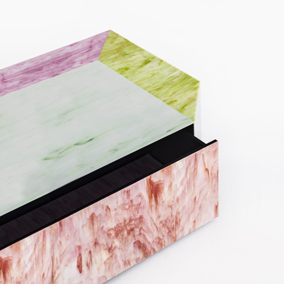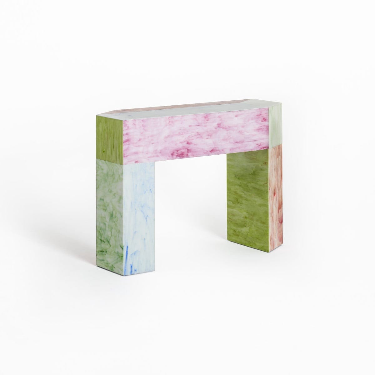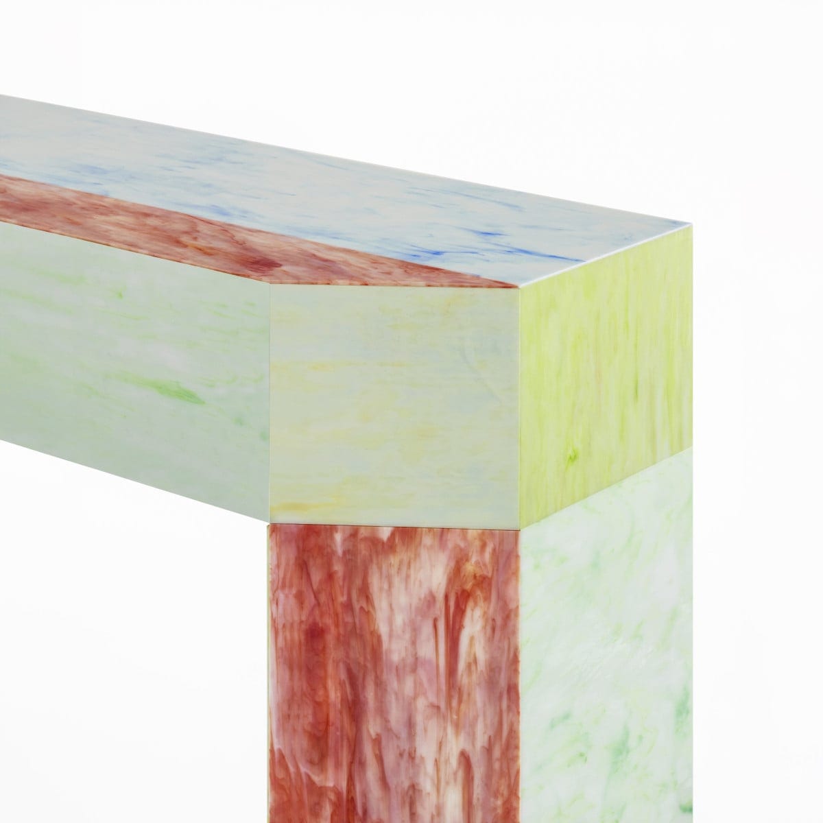 The tabletops in poured glass show evident irregularities, along with structural and chromatic differences. These are intrinsic to the material and should be expected, not treated as defects. Over time, those variations become part of the piece’s identity, not something to correct.