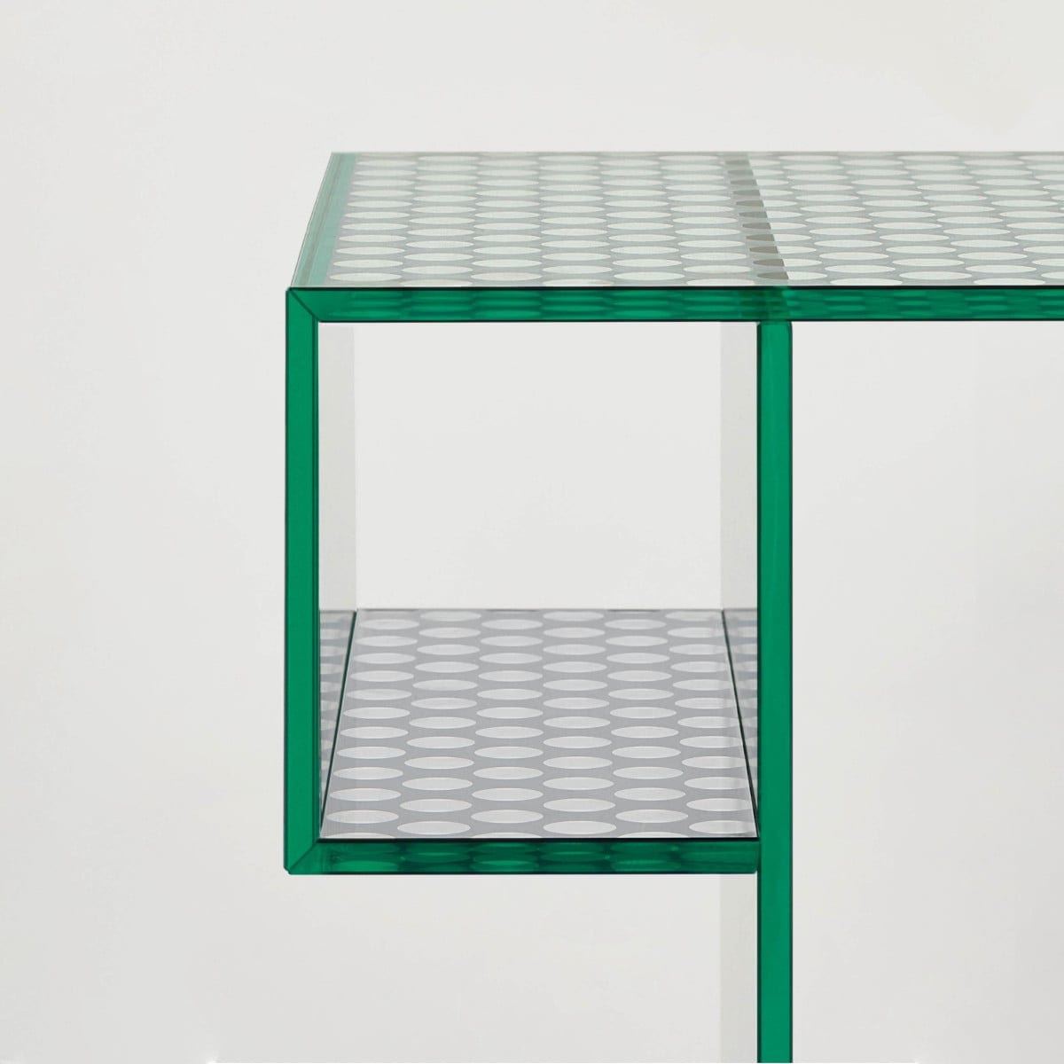 Glasitalia makes Robotin entirely in tempered glass, with UV bonding throughout. That matters in a piece like this: the structure has to feel secure, and the joins need to stay clean. The mirrored glass is double-sided, so the reflection is part of the design, not an afterthought.