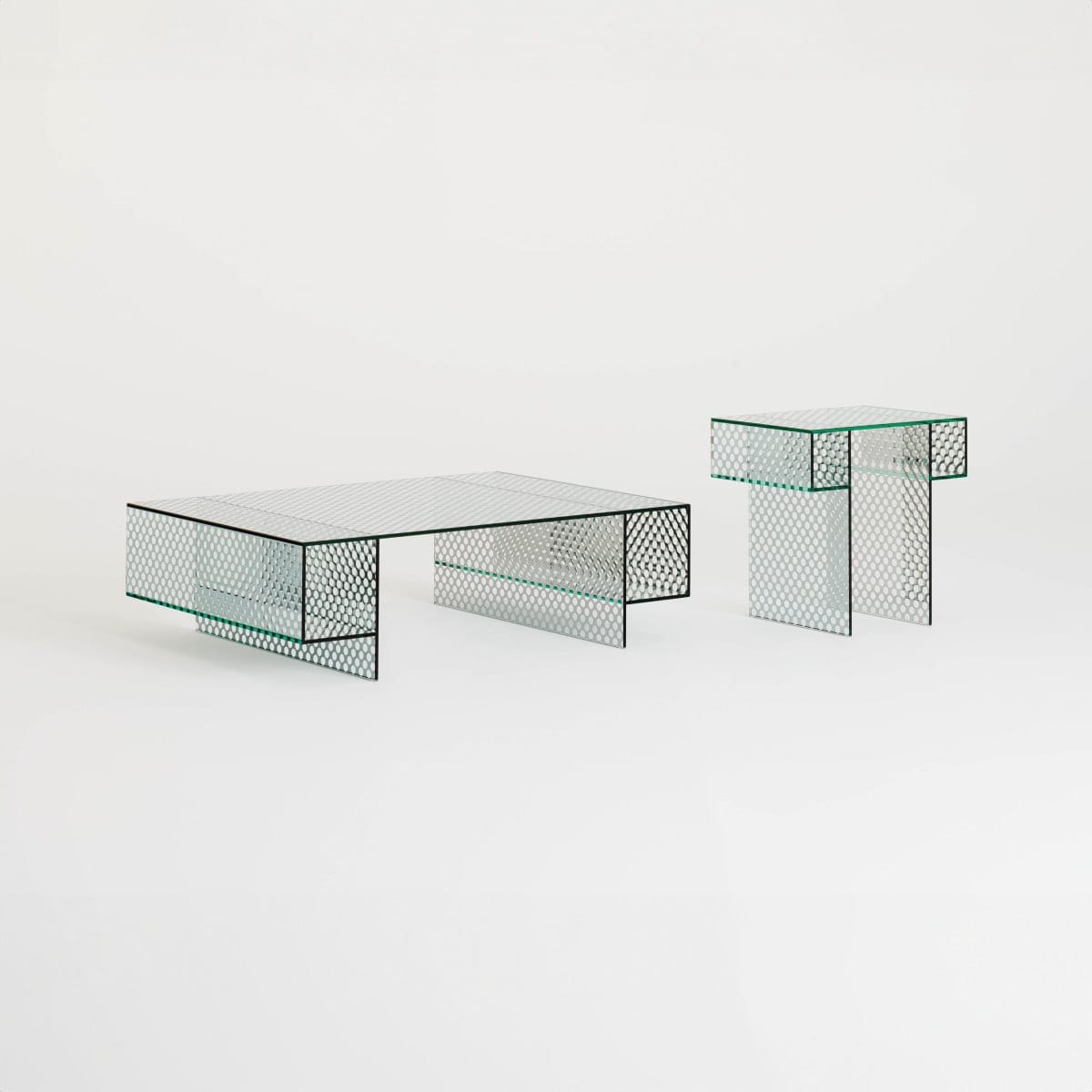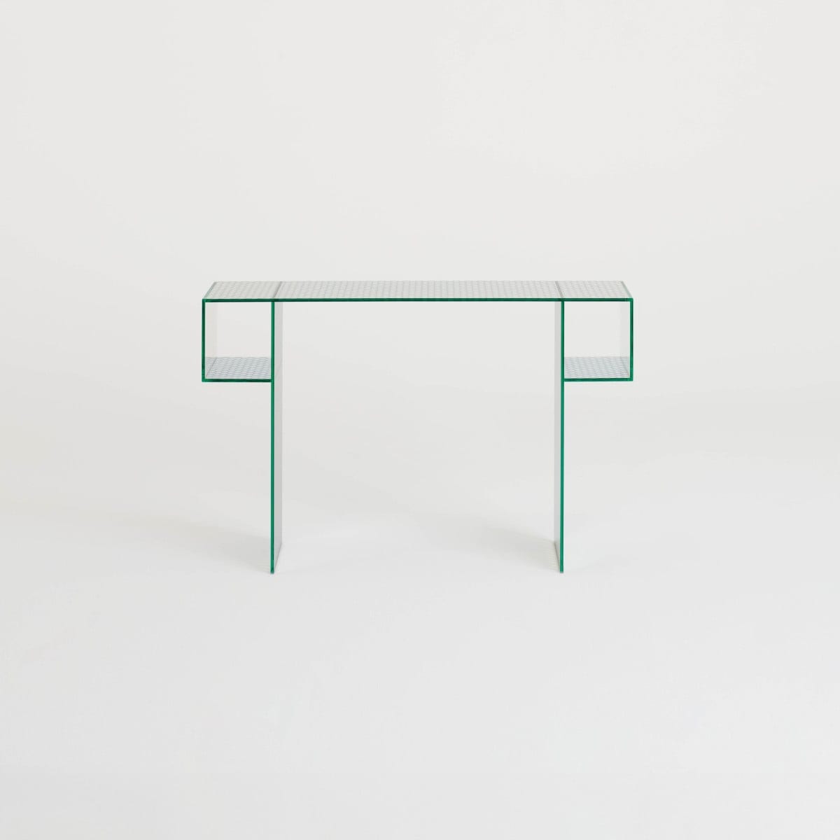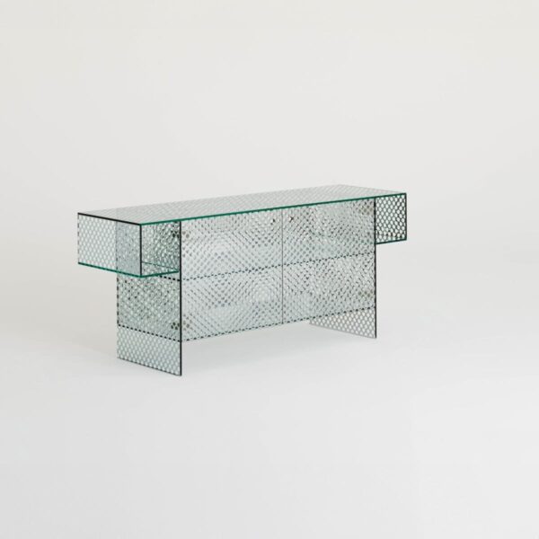 This collection is about ease. The glass surfaces read smooth and uninterrupted, so objects placed on top look deliberate—books, a tray, a single vase. But the finish still has that quiet texture from the transparent dots, which helps the mirror feel more lived-in.