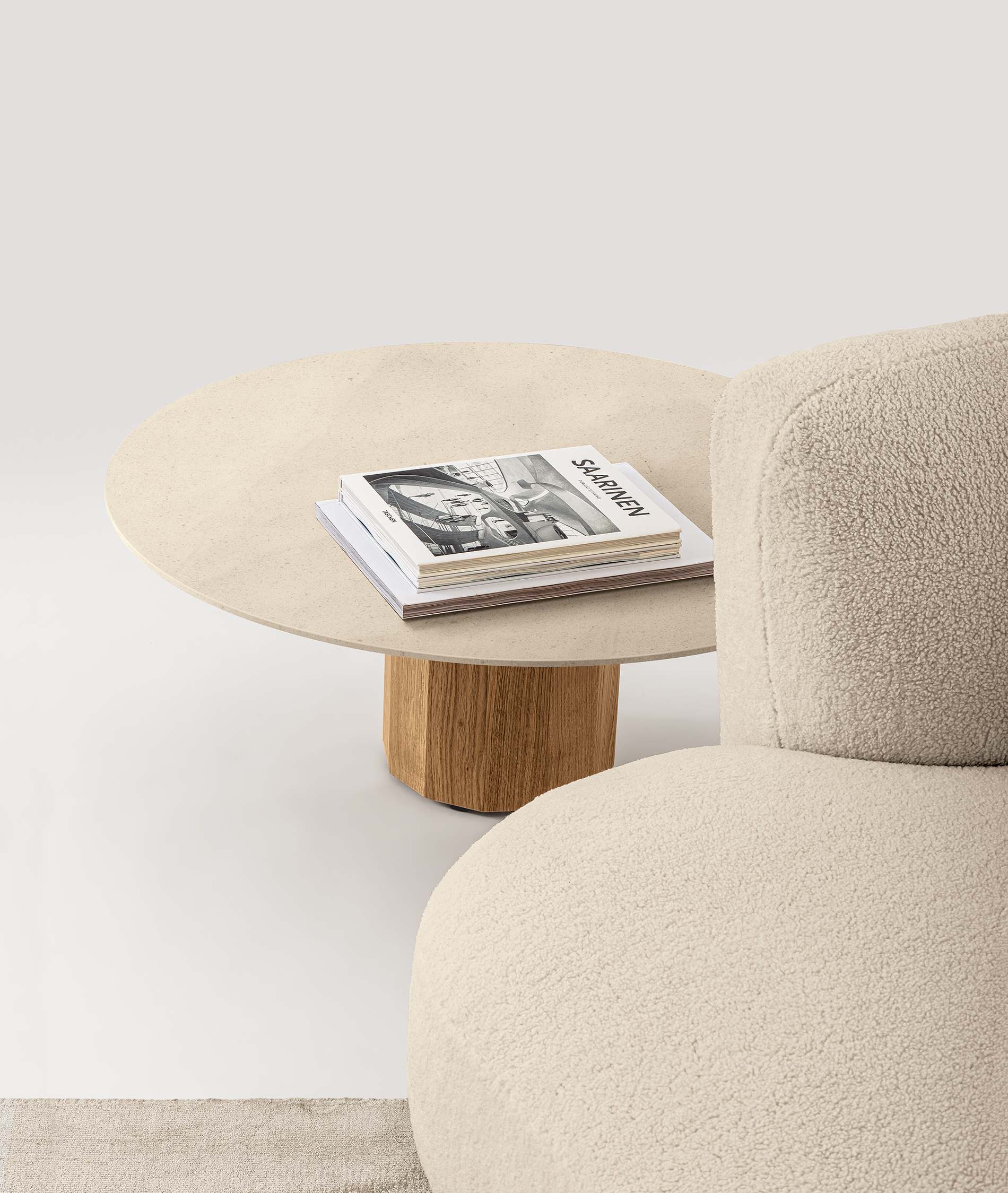 The Salinas coffee table by Talenti strips things back to what matters: shape, material, surface. The design is built around a sculptural central base that meets a clean tabletop, and the result is a visual balance that feels grounded without being heavy. Lines are soft and continuous. There are no unnecessary details competing for attention. It reads as understated and confident — the kind of piece that anchors a room quietly.