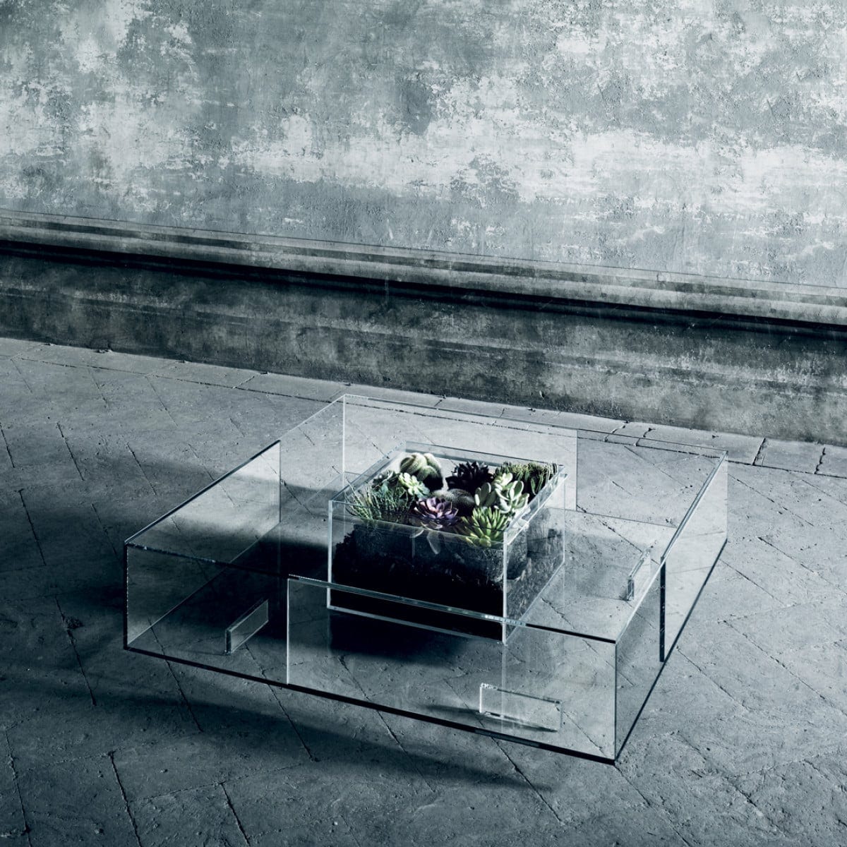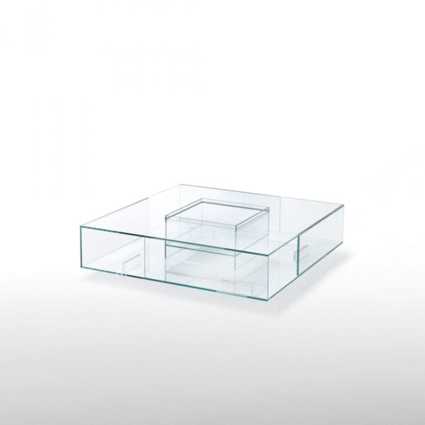 This is a coffee table meant to be lived with. The double top creates a protected space where objects can be placed inside the table, visible but contained. Books, small sculptures, or found pieces can sit there without crowding the main surface. But the table still reads as light, thanks to the transparency.