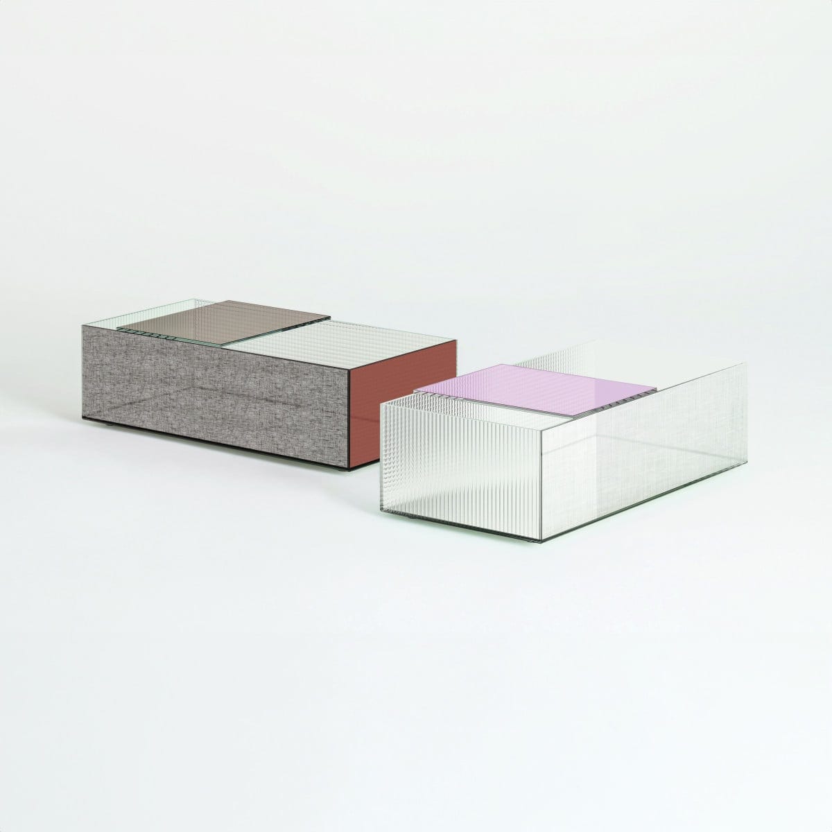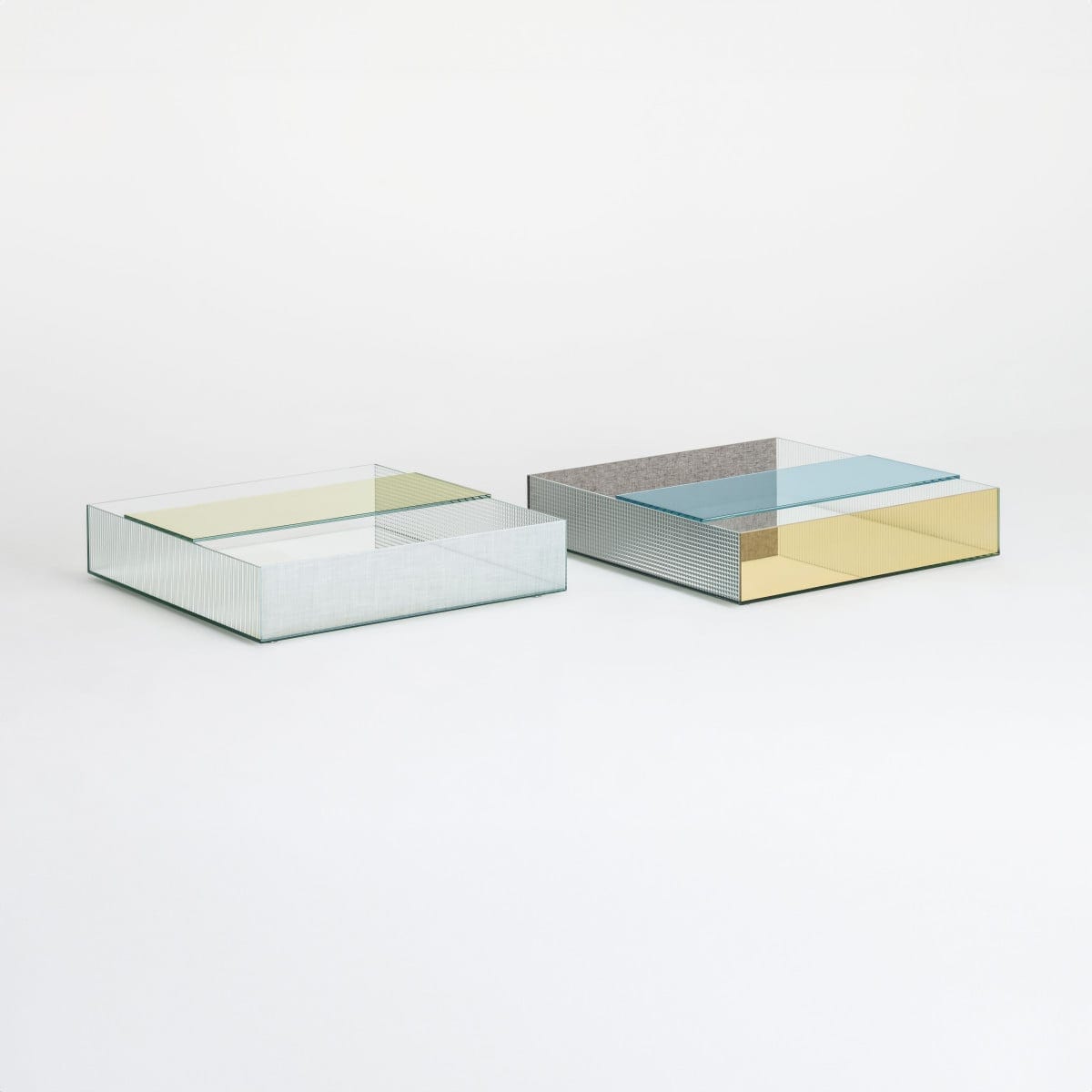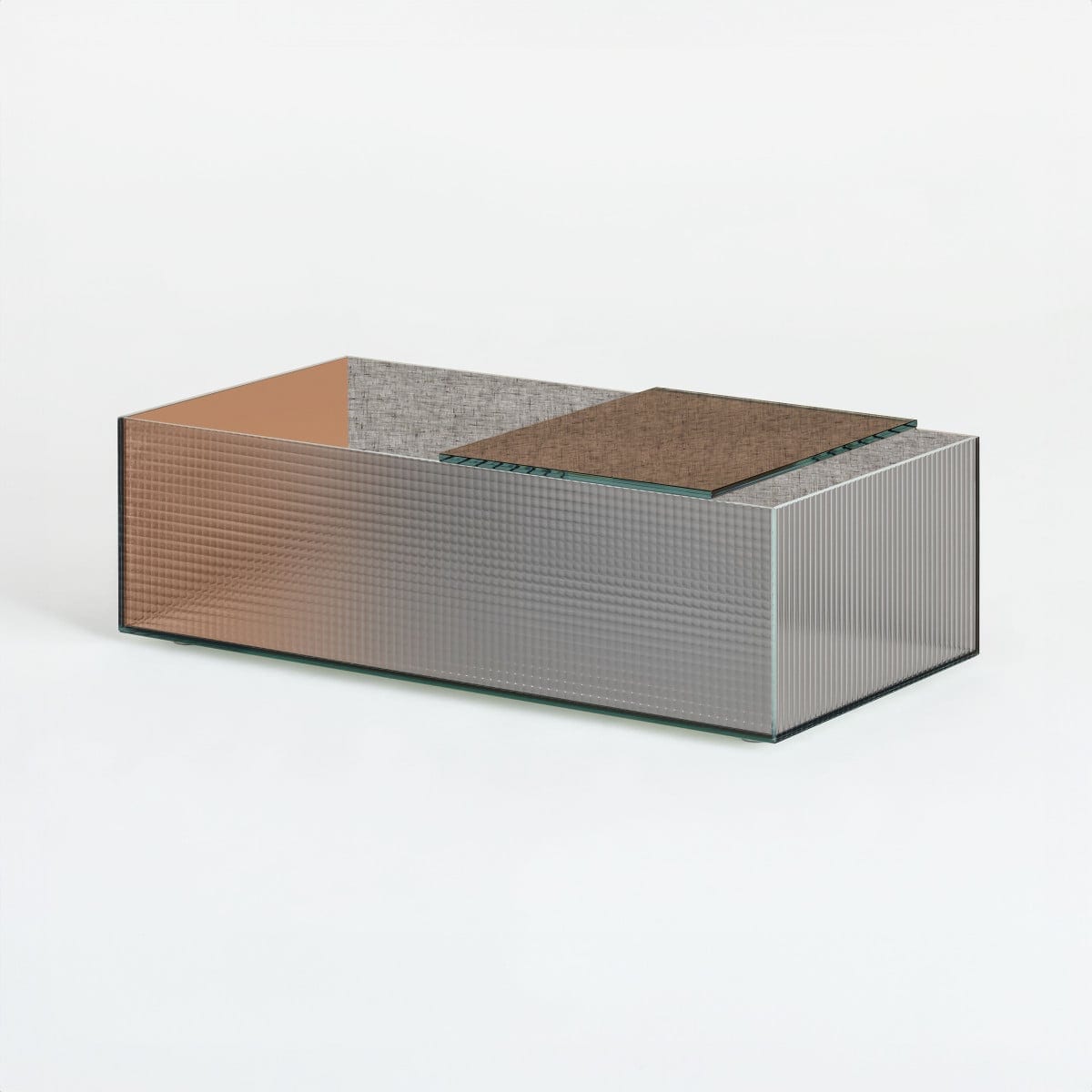 Spectrum is a low table with a clean, tub-like silhouette and a strong sense of geometry. The form is simple at first glance, but it has depth. The mirrored base pulls light into the volume, while the four vertical sides do the visual work with texture, pattern, or color.