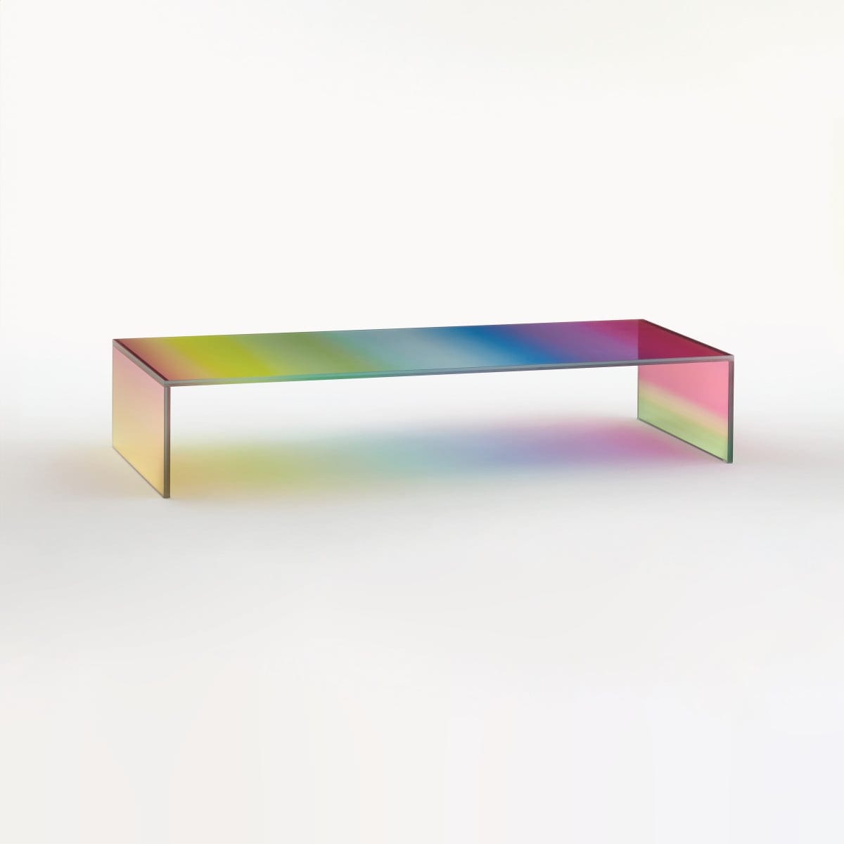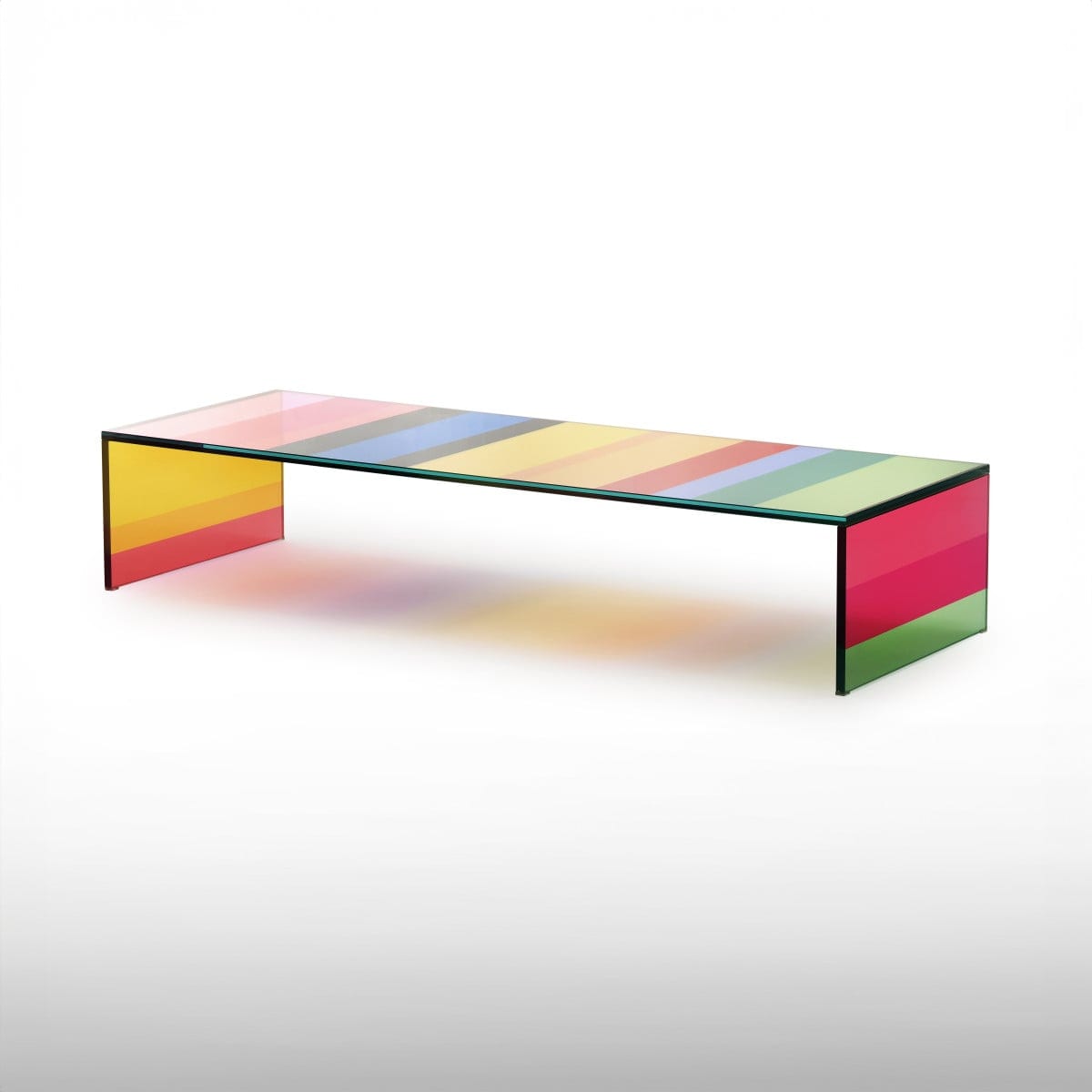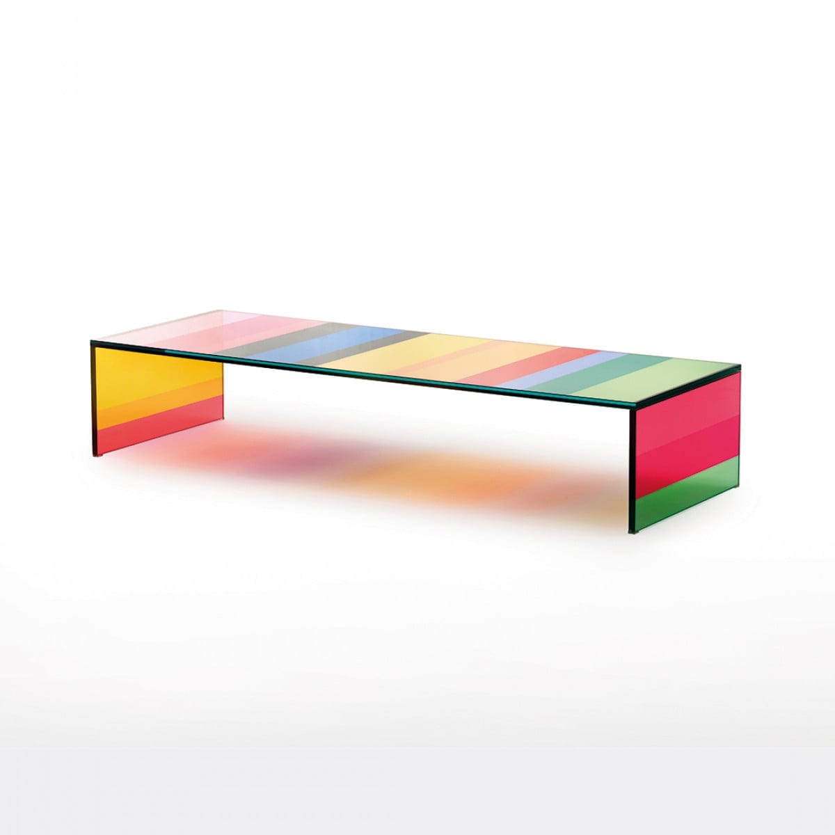 glasitalia makes this table in laminated extralight glass. The glass has a refined clarity, and the lamination gives it structure while maintaining that crisp, precise edge that makes glass furniture feel so modern. The top and sides carry a multicoloured finish created through a sophisticated technical process. It’s not a surface print that stops at the edge; the colour belongs to the piece, continuing across the planes.