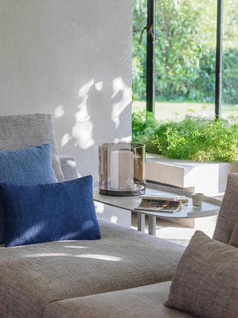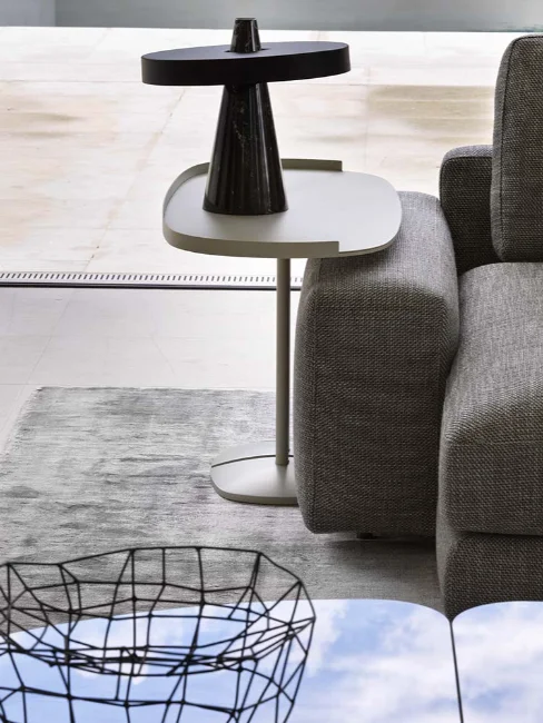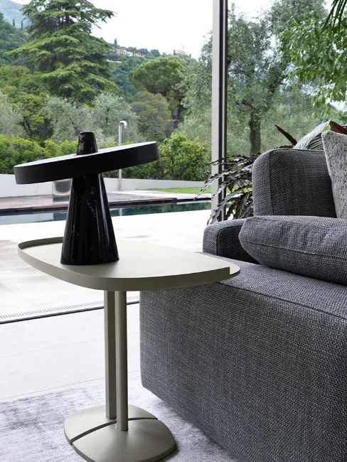 The oval top of the Victoria Small Table is supported by two slim central legs in the standard version or by a single offset leg in an alternative design. This unique configuration makes it particularly adaptable, enabling the table to fit seamlessly beside sofas, poufs, or beds. The stability of the table is further enhanced by a wooden base that matches the metal structure, ensuring a balanced and secure foundation.