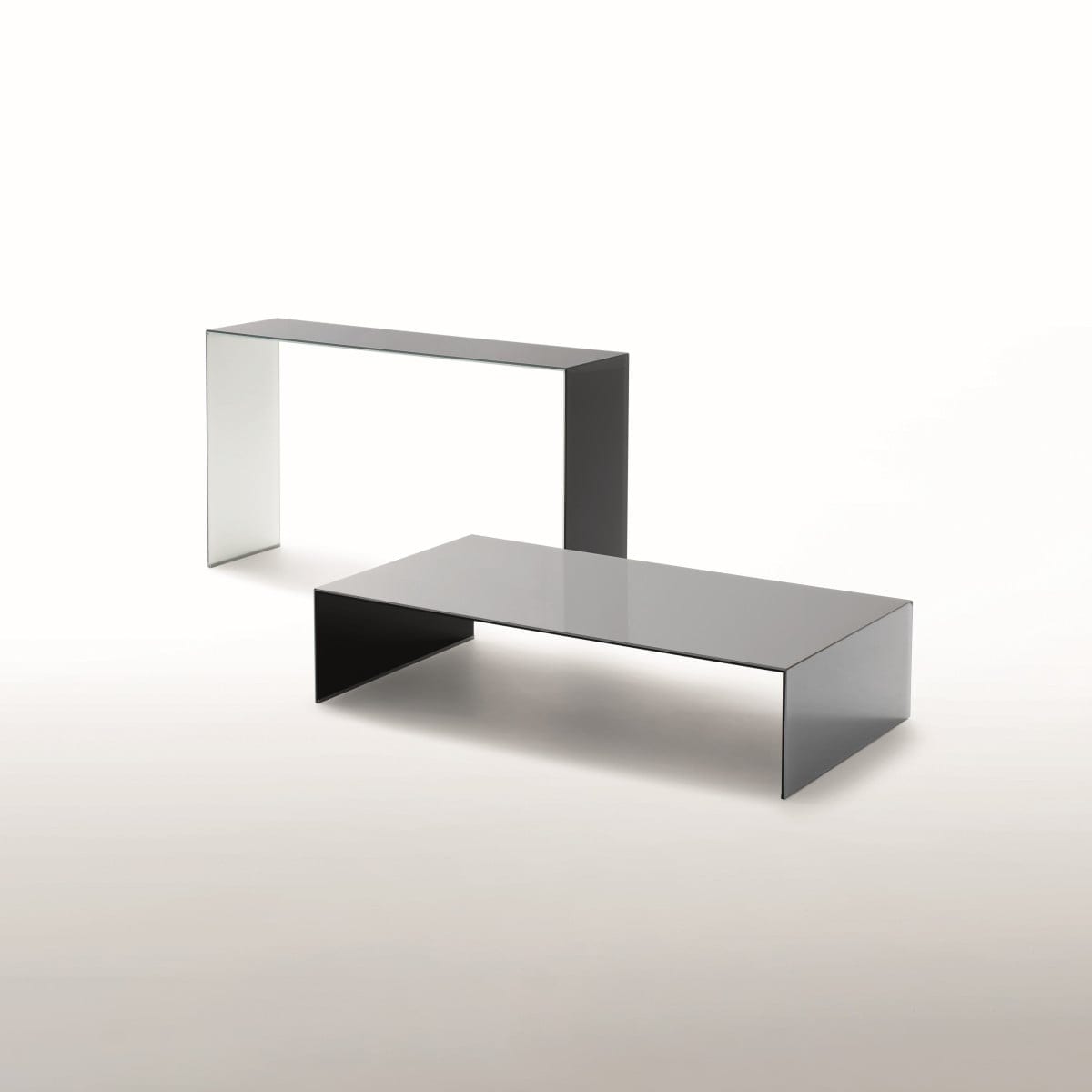 Each piece is made in coupled laminated glass, finished in either glossy lacquered glass or opaque lacquered glass. The lacquer brings depth to the surface, while the laminated construction gives the table its visual solidity. It looks crisp and polished, with that particular clarity only glass can deliver.