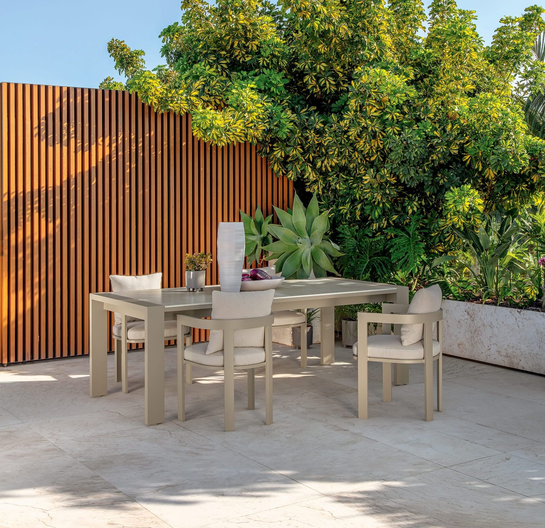 Nothing shouts. Edges are clean, transitions are measured, and the silhouette reads crisp from every angle. The result is contemporary, but not cold—inviting enough for long meals, polished enough for a formal terrace.