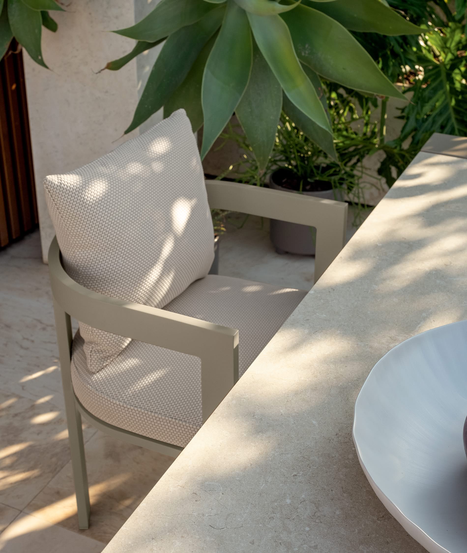 Whether arranged around a long dining table or paired in twos on a veranda, the chair integrates seamlessly with the Argo//Alu language. It reads as one family without feeling uniform, which makes planning a complete outdoor scene straightforward.