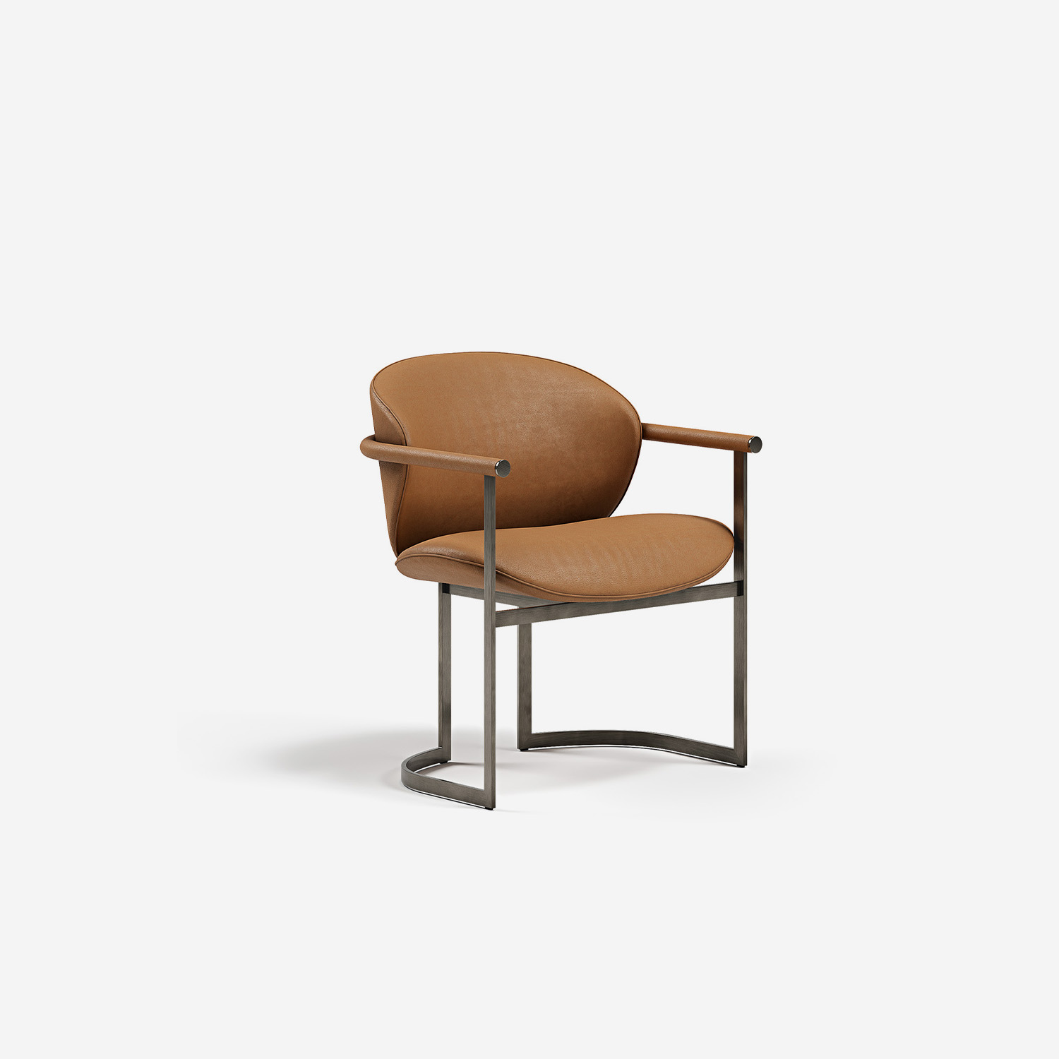 Flora is available in carefully chosen fabrics and leathers, supported by the metal base for long-term use. A tubular leather element traces the armrest and gently wraps the back, adding a tactile detail that instantly raises the level of finish. The mix of metal, fabric, and leather is straightforward, but handled in a way that feels quietly luxurious.