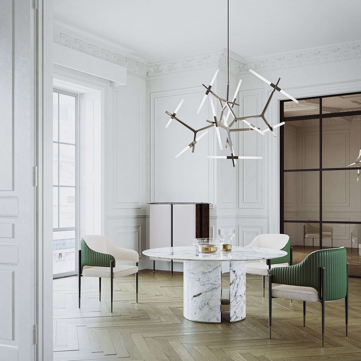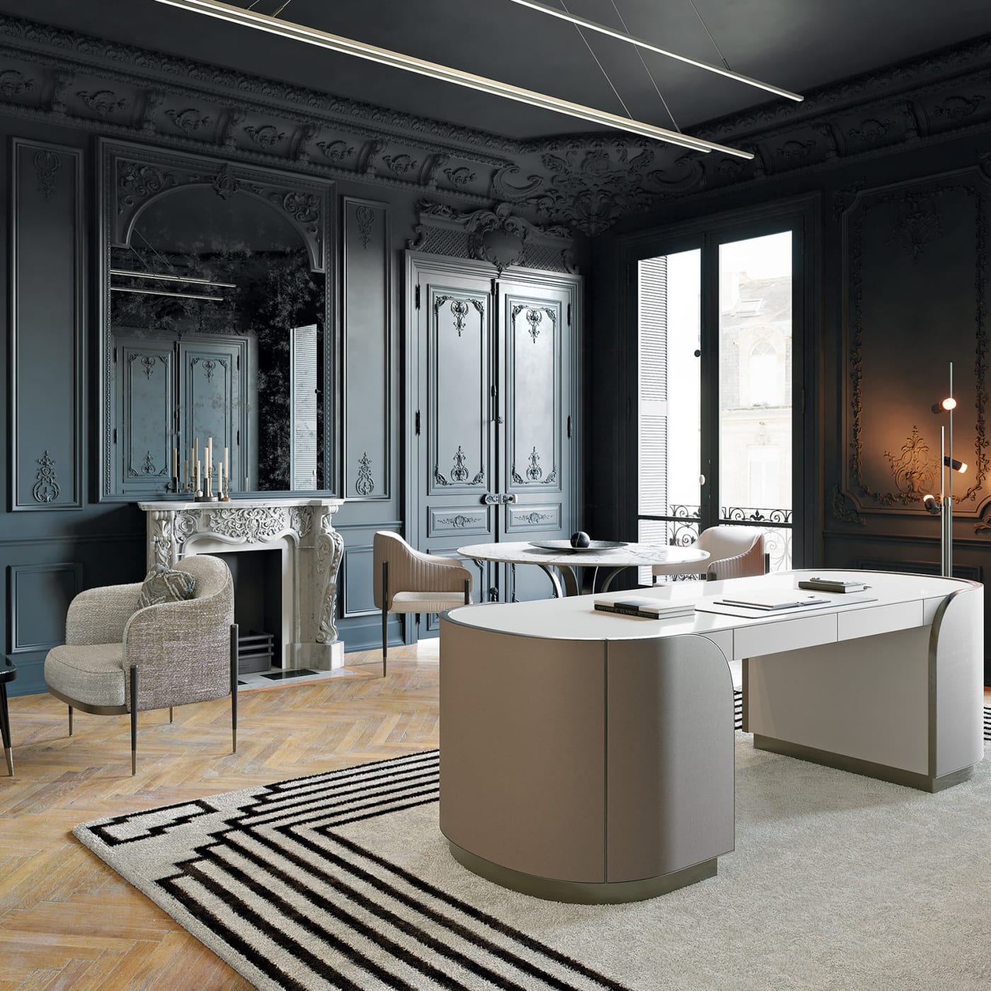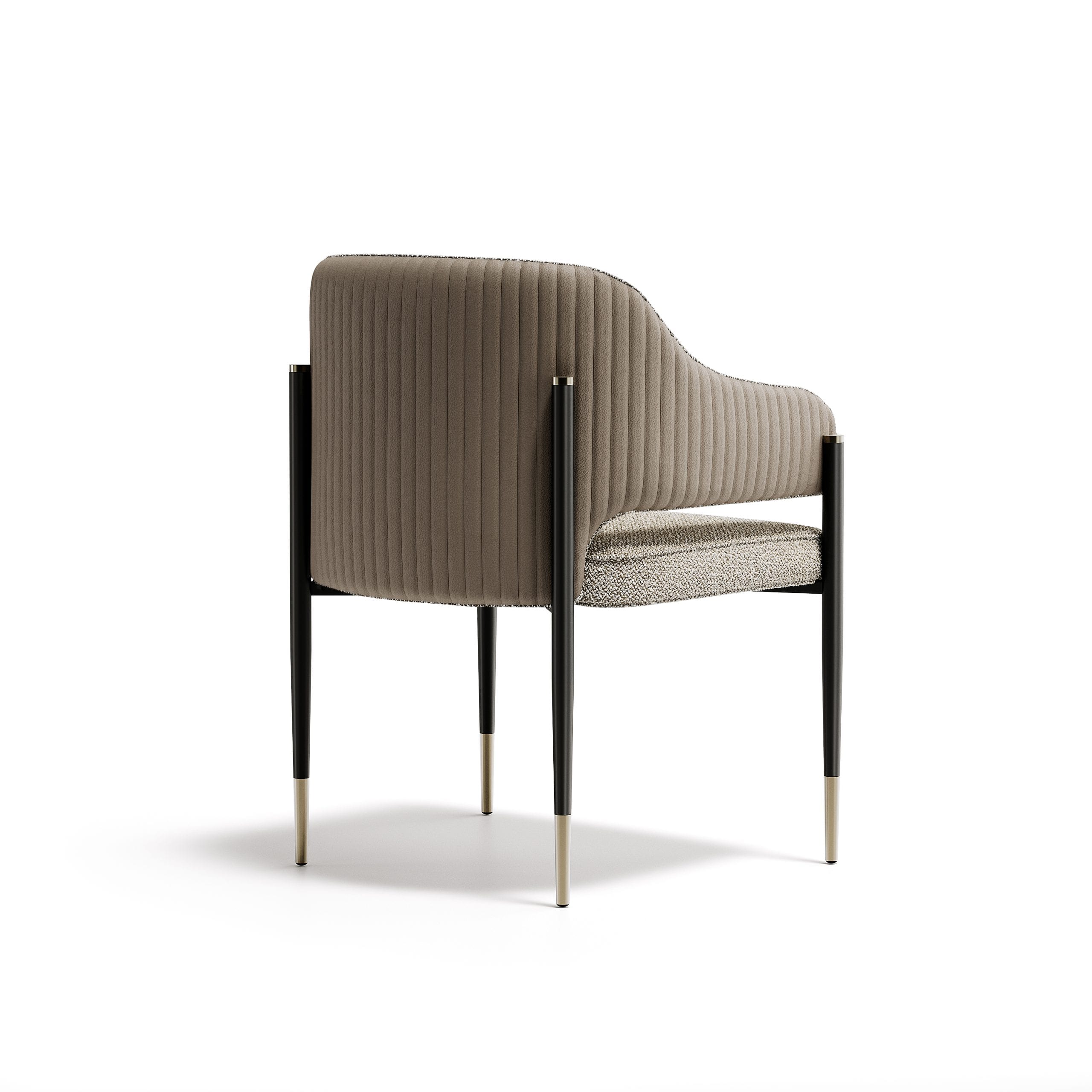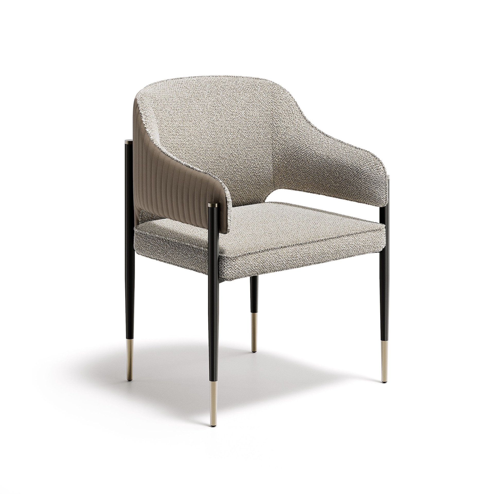 The legs are in painted metal, anchored by feet with a matching metal finish. This metal base brings stability and a clean, modern edge. Leather and fabric options allow the character to shift from more formal to relaxed, while the metal finishes complete the piece with a precise, tailored feel.