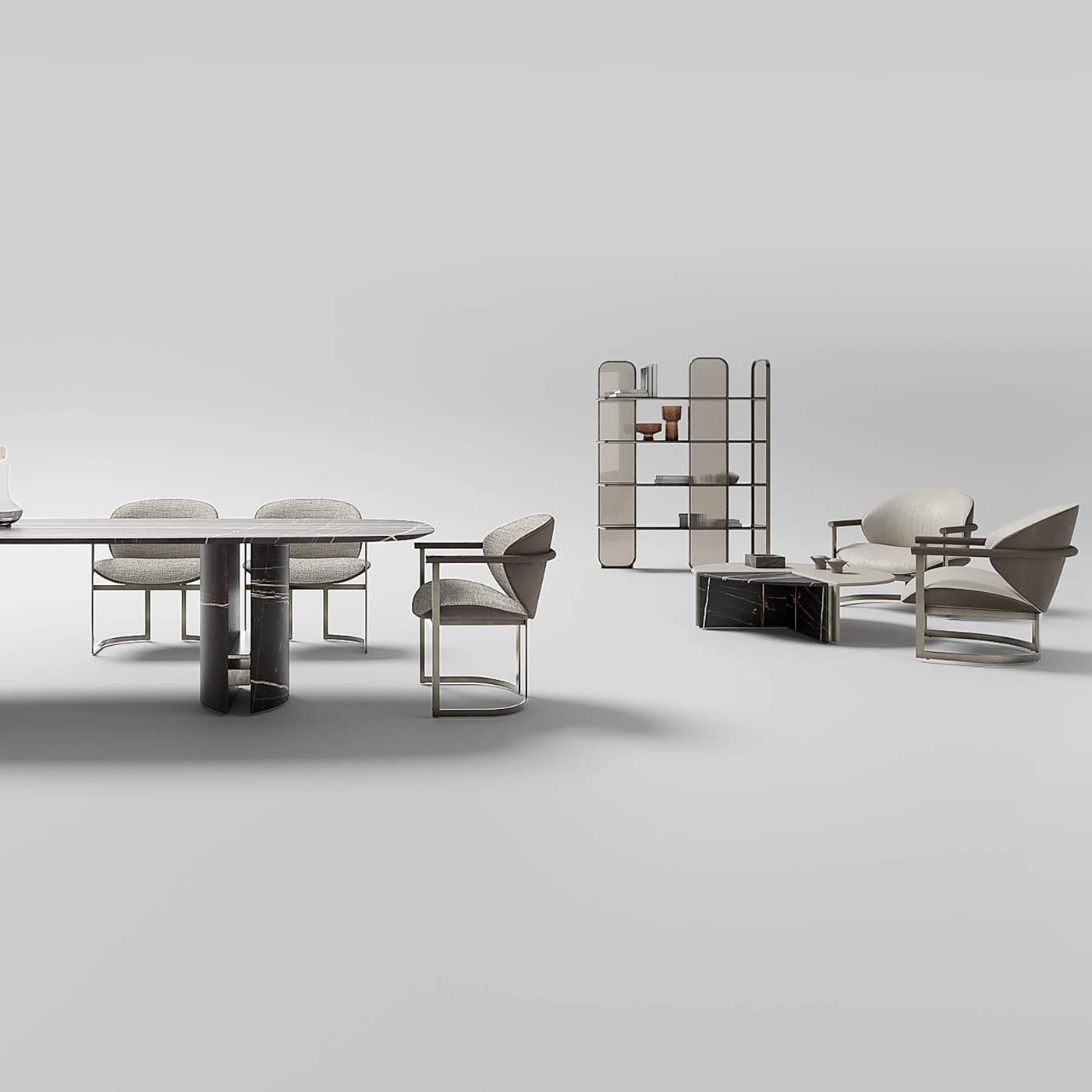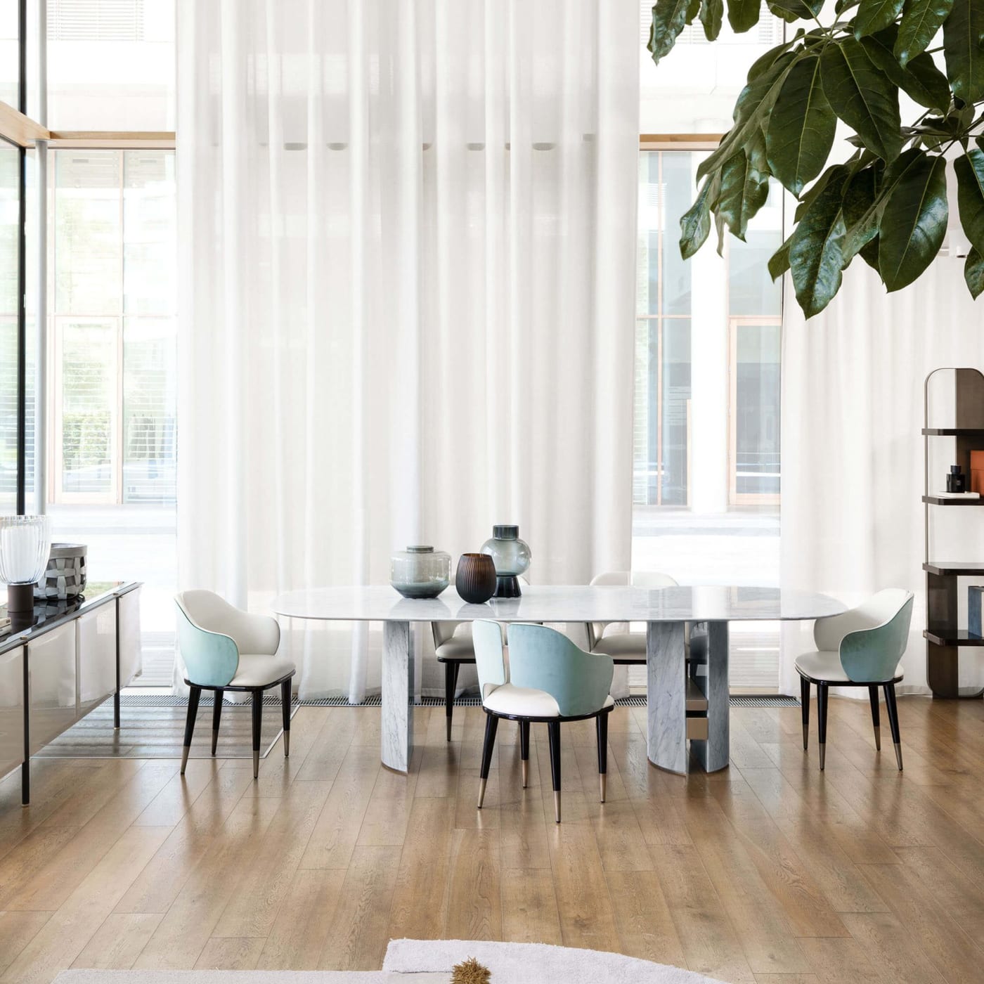 The Ercole Oval dining table from Capital is built around a clear idea: a single, sculpted marble volume with a calm, architectural presence. Developed from a pure marble block, its profile is deliberately simple, without unnecessary lines. The oval top softens the geometry, giving the table an inviting, approachable look while still feeling substantial in the room.