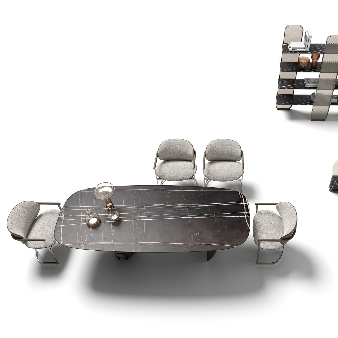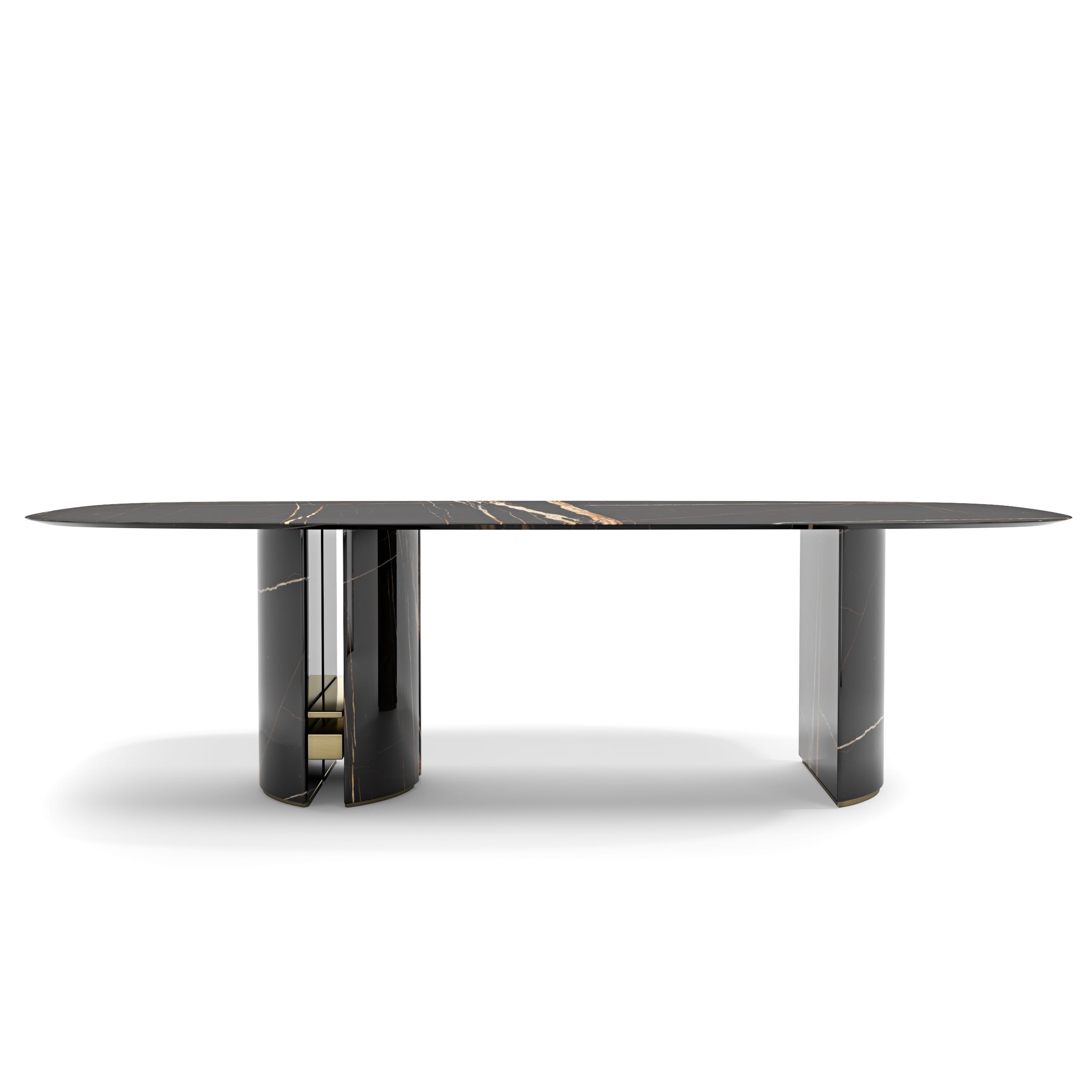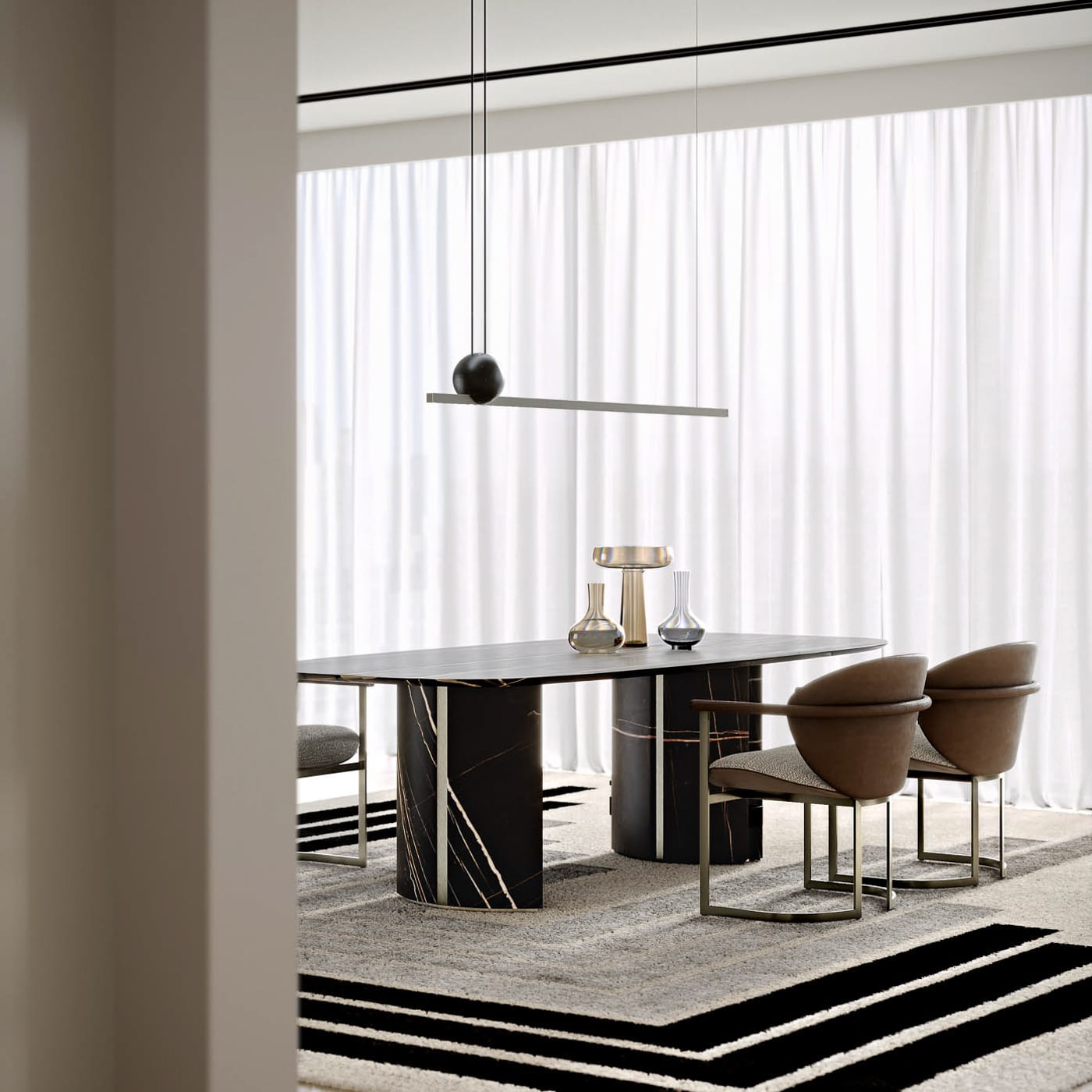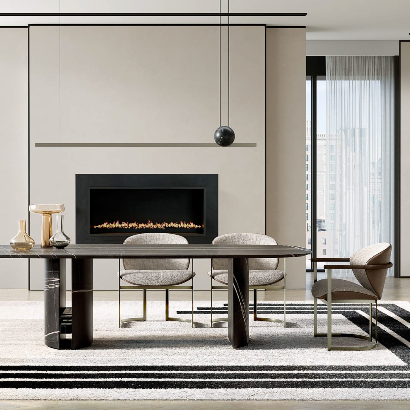 The Ercole Oval is entirely focused on marble and metal. The top and base are crafted in marble, giving the table continuity from surface to floor. A metal central insert and refined metal details are integrated into the structure, not just added on, so the transition between stone and metal feels deliberate and controlled.