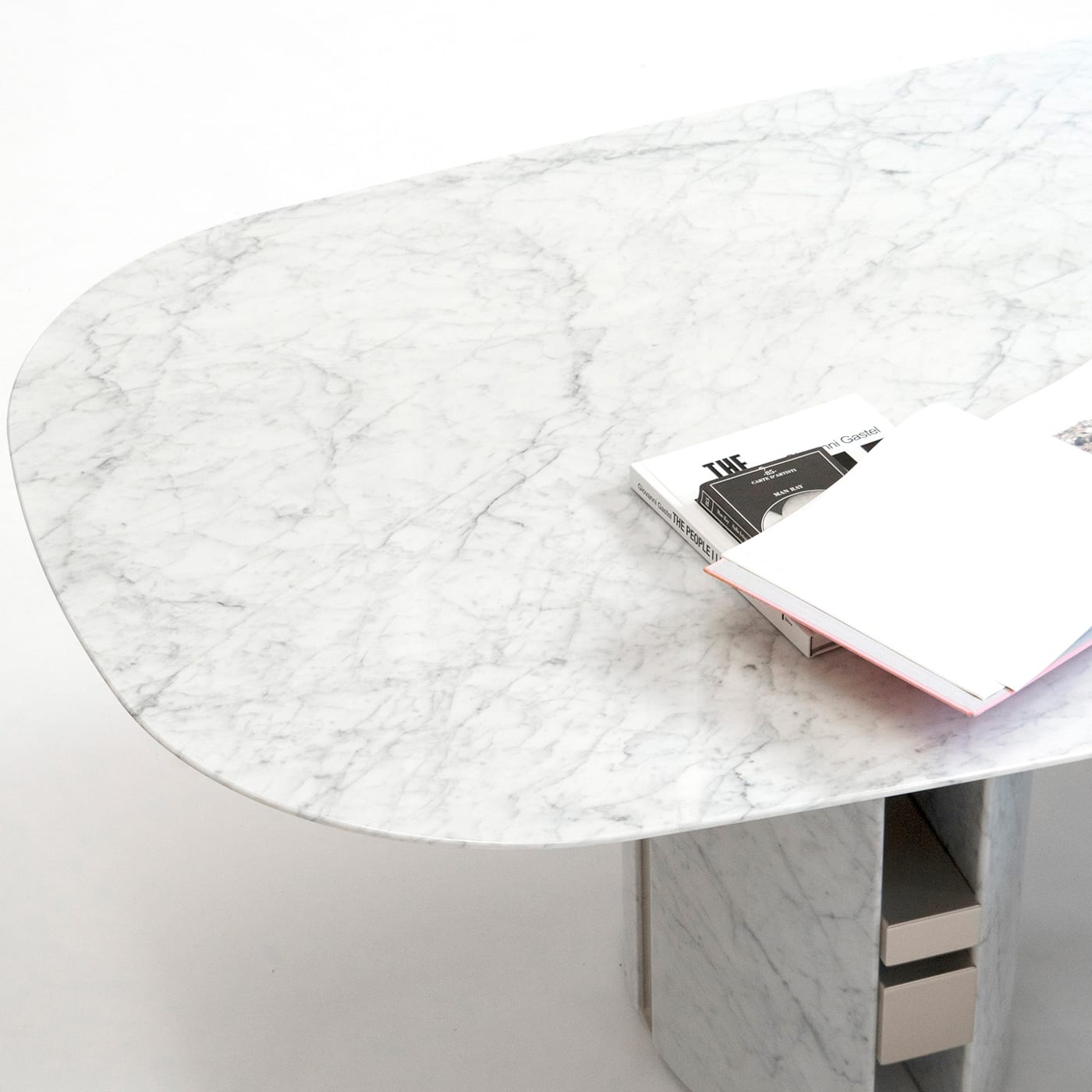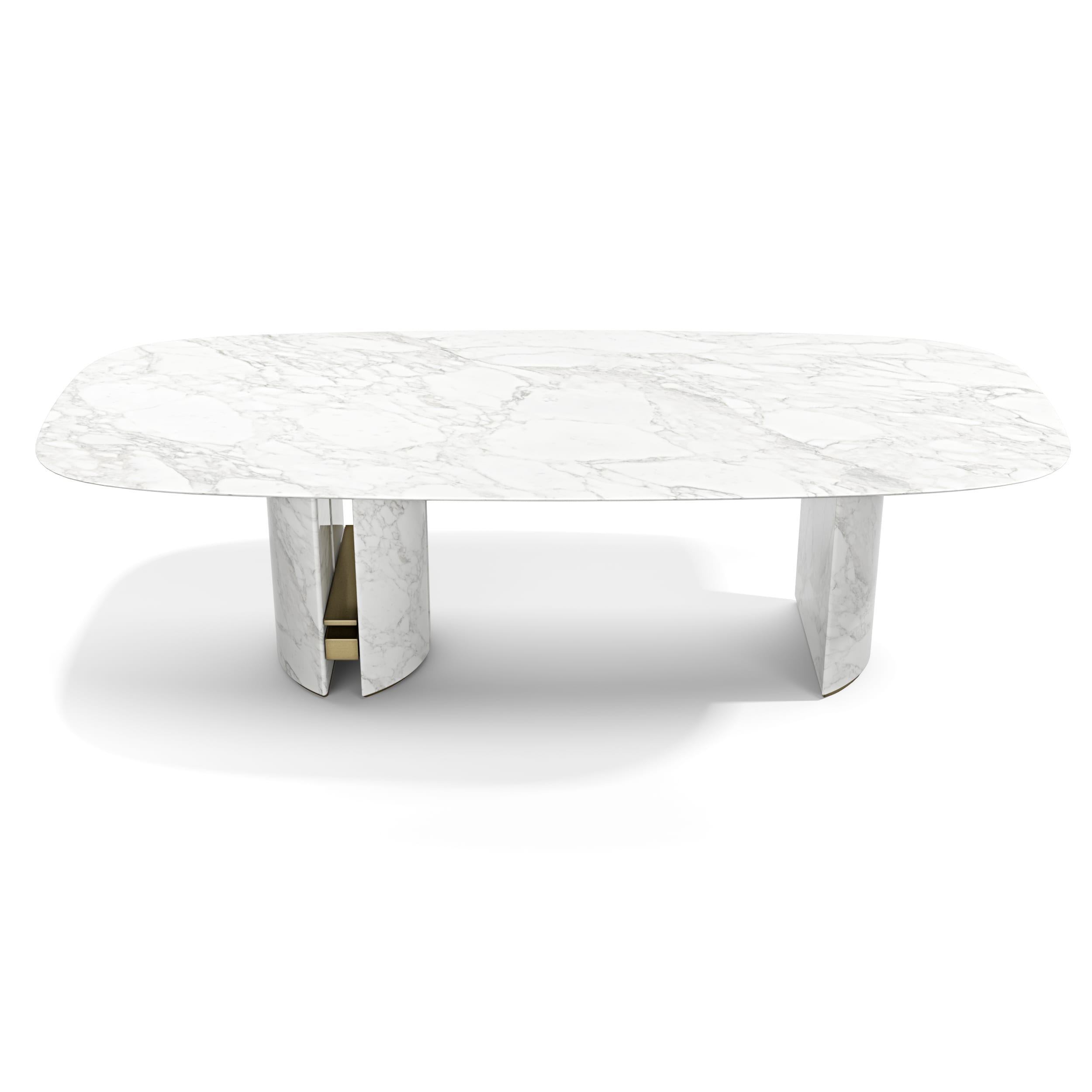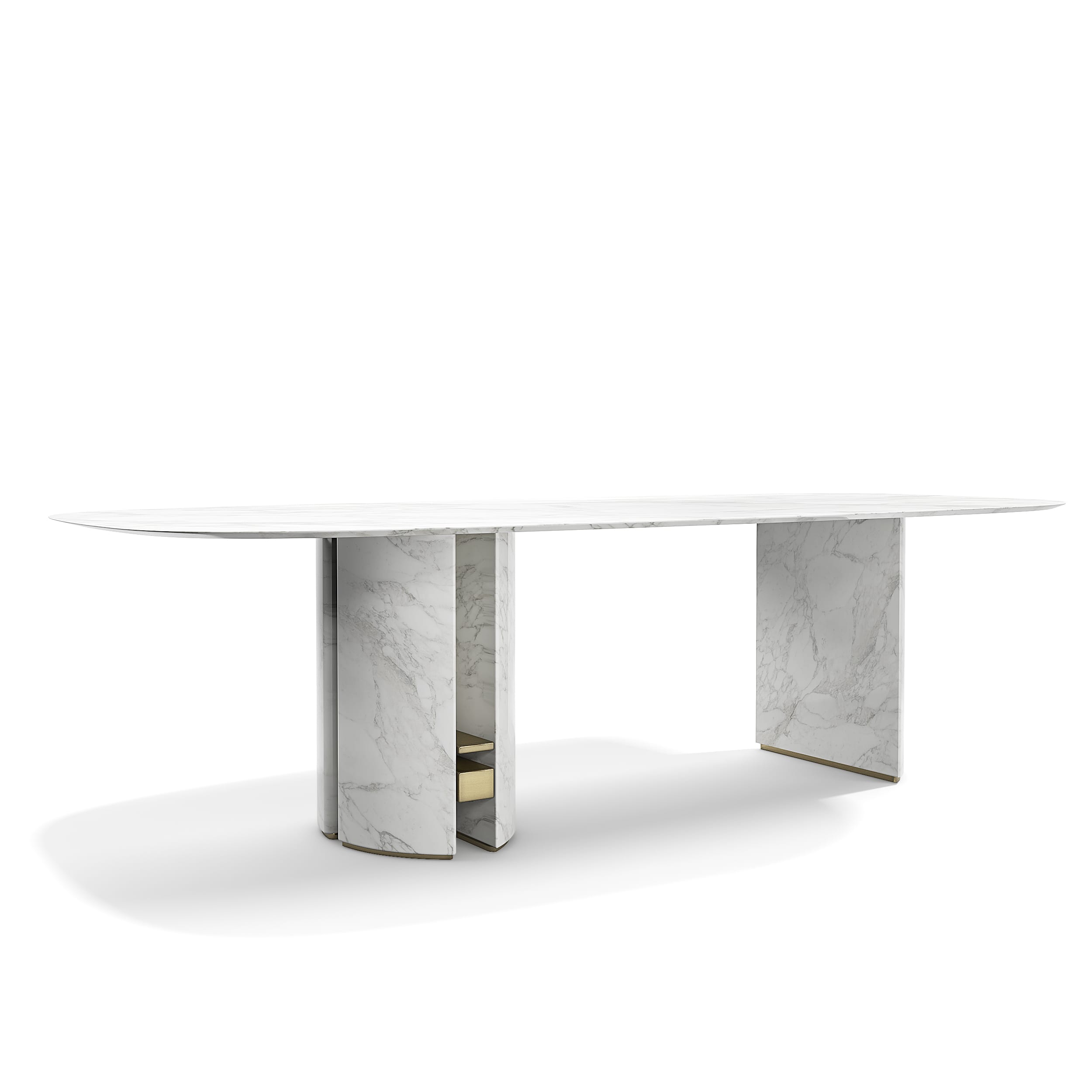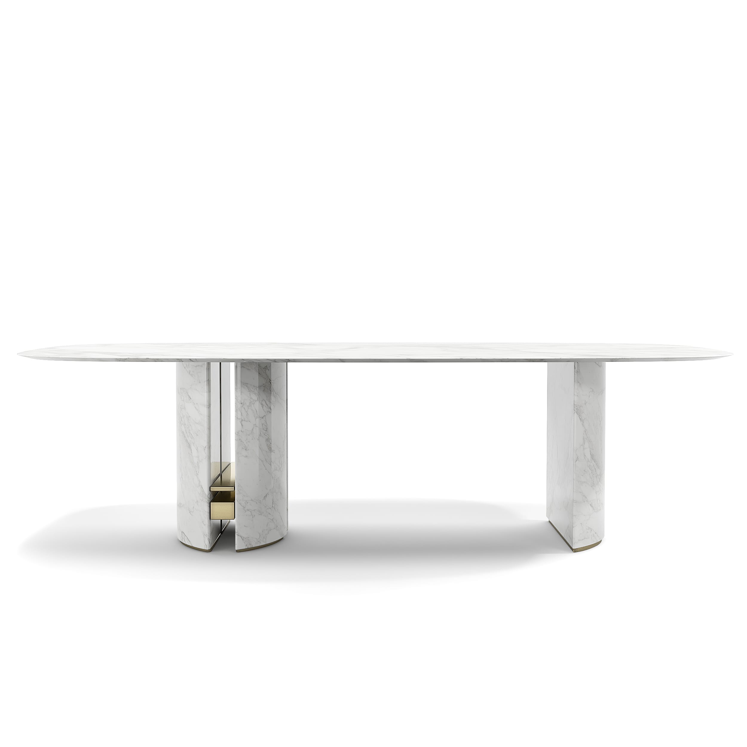 The Ercole Oval is entirely focused on marble and metal. The top and base are crafted in marble, giving the table continuity from surface to floor. A metal central insert and refined metal details are integrated into the structure, not just added on, so the transition between stone and metal feels deliberate and controlled.