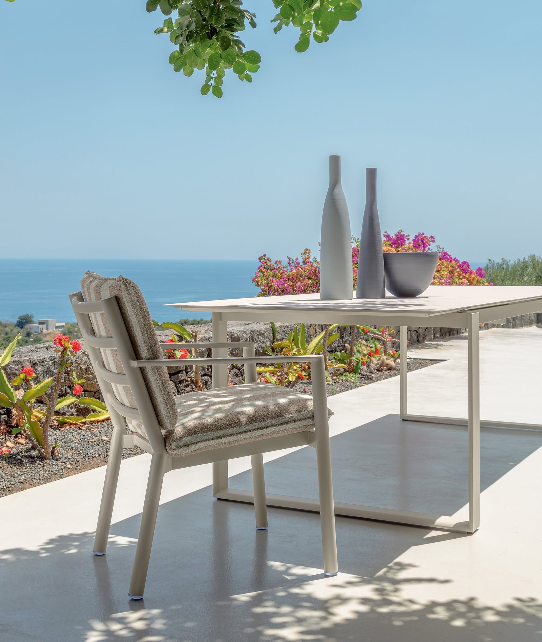 Built to live outdoors without compromise, Finn stands up to weather and wears well with minimal effort. Aluminum resists the elements, and maintenance is straightforward: quick wipe-downs keep the surface ready. A cover is available for added protection during harsher seasons or longer breaks. It’s not stackable, by design, which preserves the clarity of the form. With simple care, the Talenti Finn stays consistent season after season, aging neatly rather than loudly.