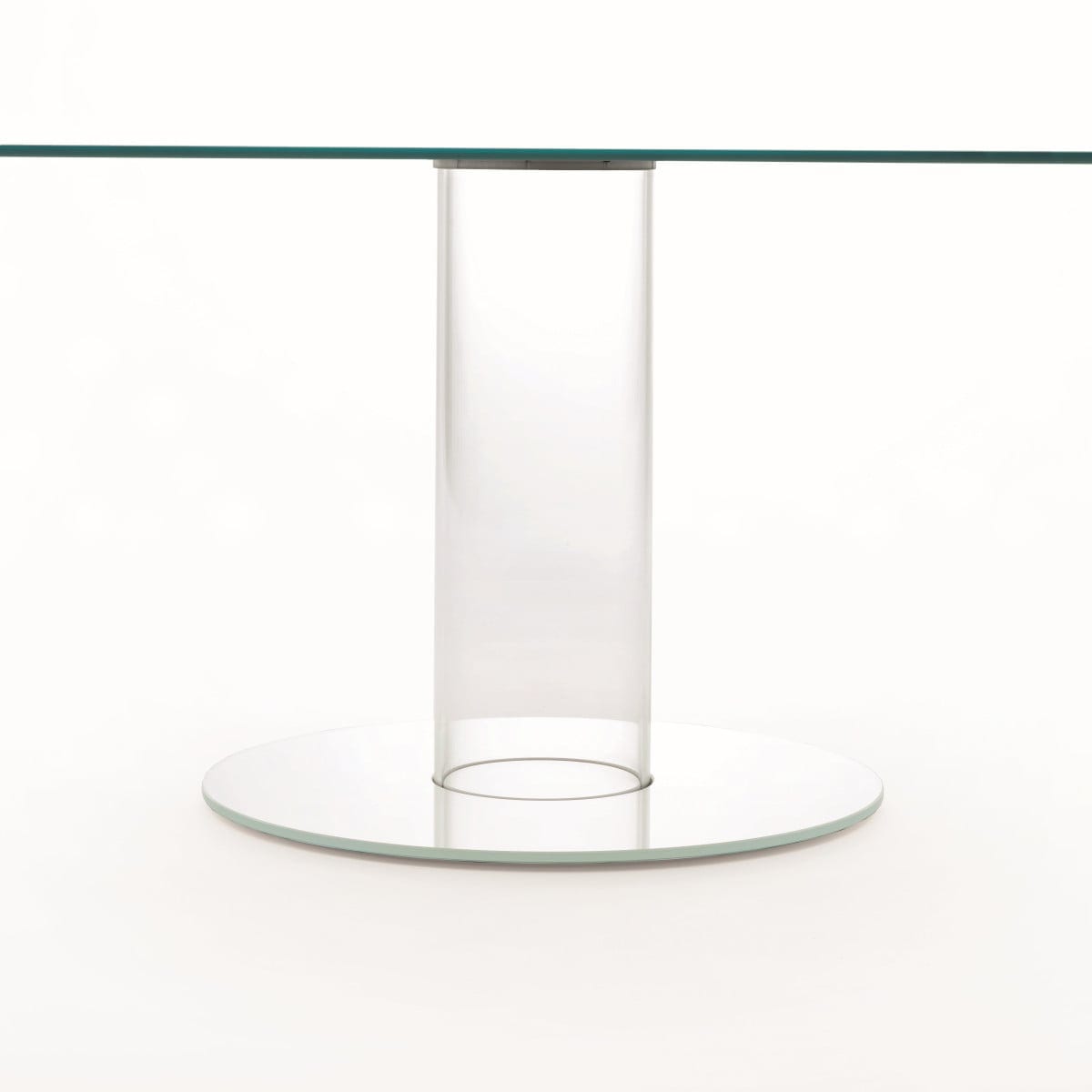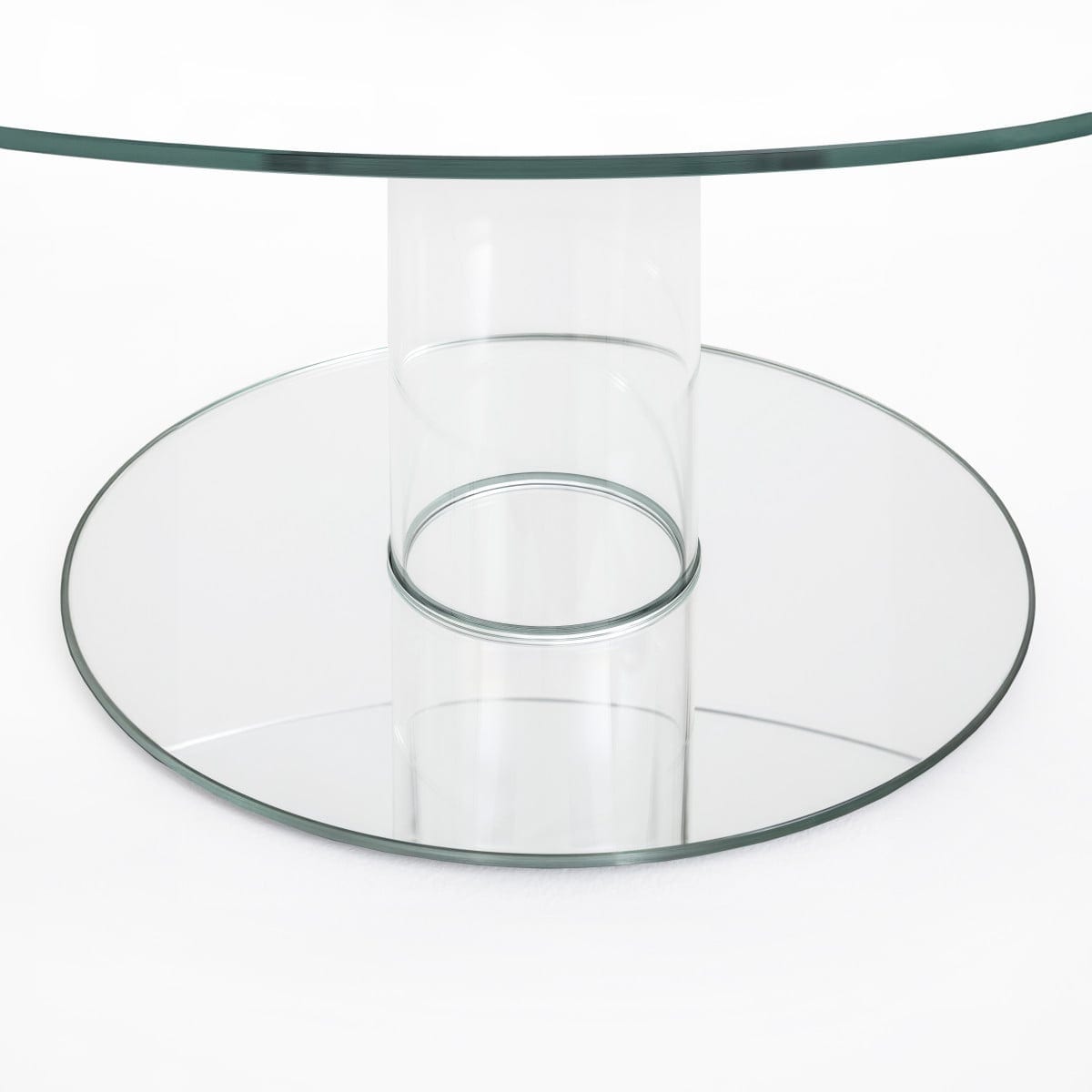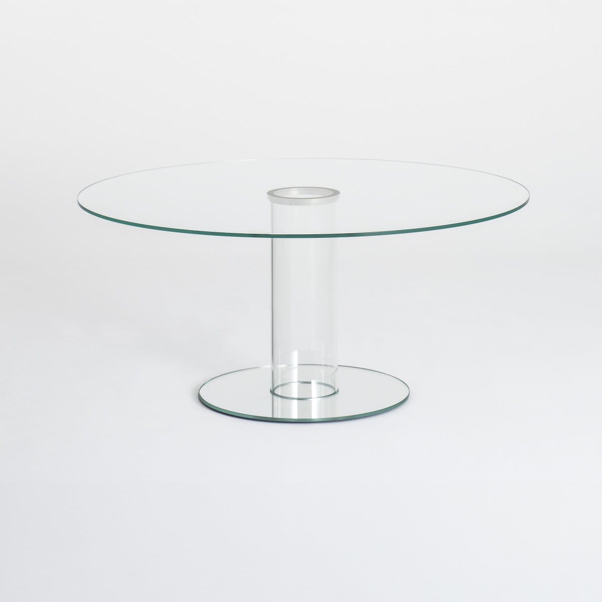 The top is tempered glass, 0.47 inches thick. It sits on a base made from a hollow borosilicate glass cylinder, paired with a 0.47-inch glass foot that provides ballast. The construction is precise and direct, with the top designed to be disassembled and secured to the base using rings in stainless steel and anodized aluminum.