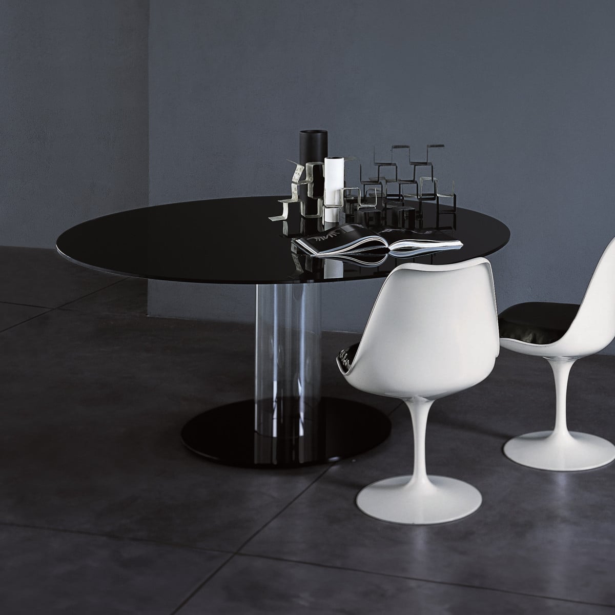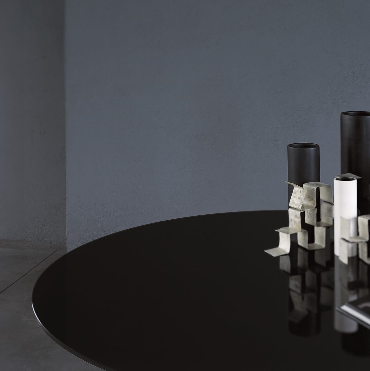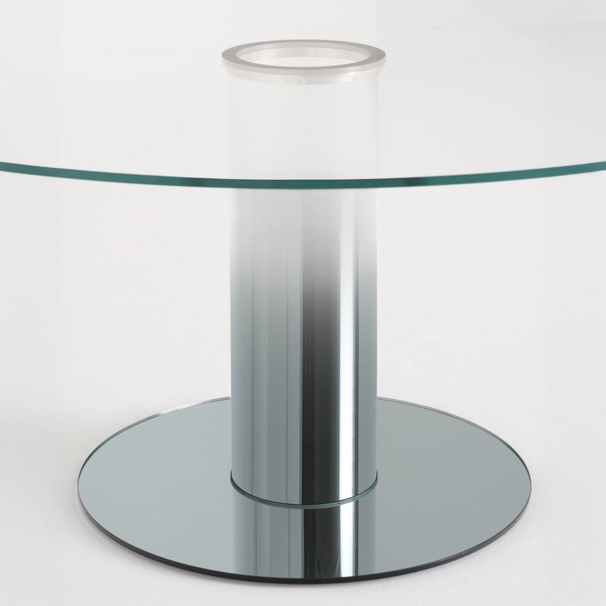 Finishes are kept focused and modern: glossy or opaque lacquered glass, or a transparent extralight top with an extralight mirrored foot. For the extralight configuration, a mirrored cylinder is also available with a fade that shifts from bottom to top, giving the base a softer visual edge without changing the silhouette.