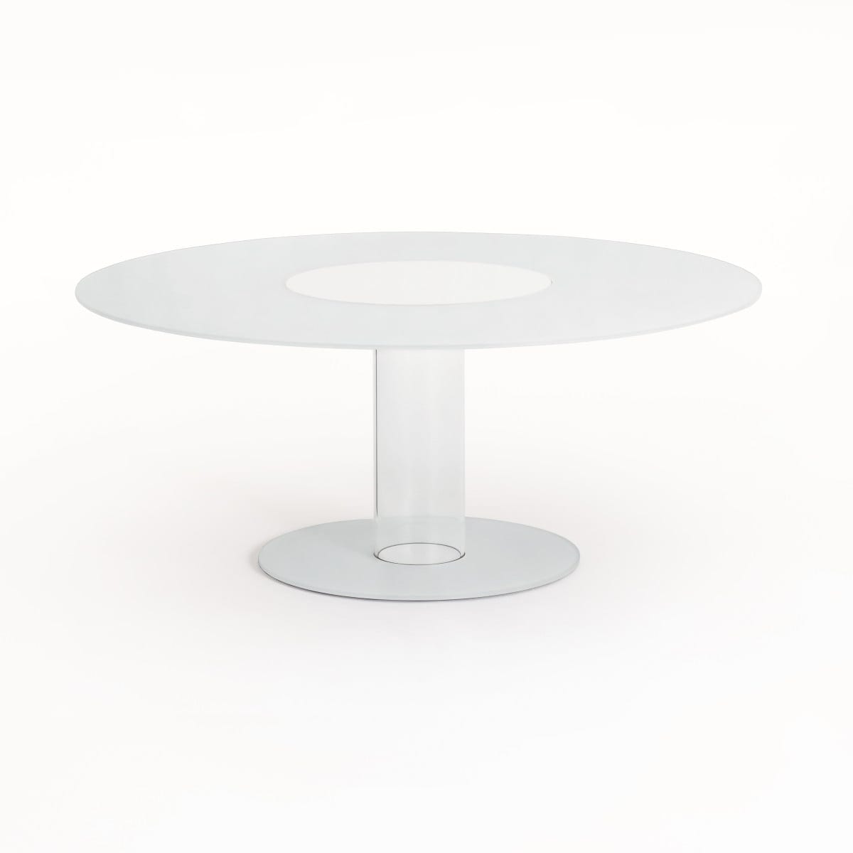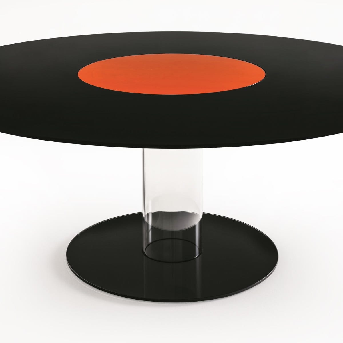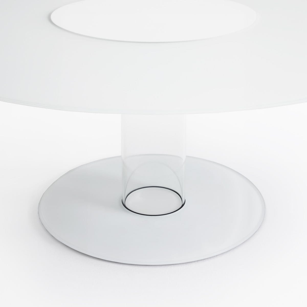 The removable top is supported by a borosilicate glass cylinder. It’s fixed to a ballast positioned under the lacquered glass foot, a structural choice that keeps the table stable while letting the overall impression stay light. It’s a very Glas Italia way of engineering: visually minimal, technically resolved.