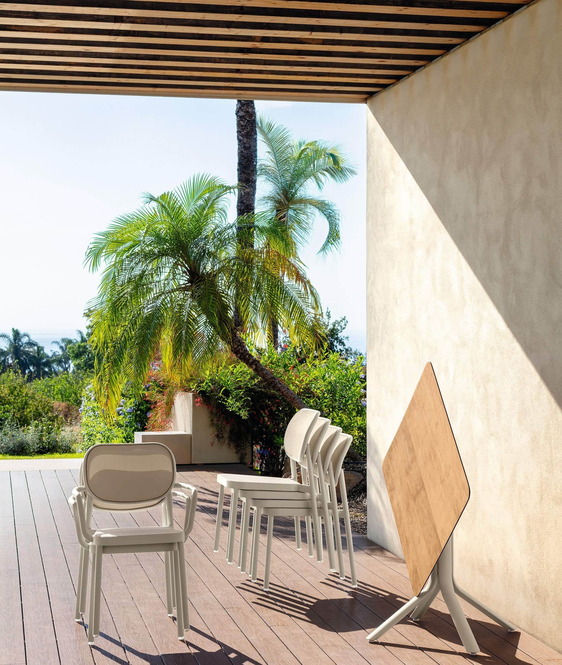Indoors or out, residential or contract, Meg adapts. It sits well on a balcony, a garden deck, a compact dining area, or a café terrace. In white, it brightens; in charcoal, it sharpens; in warm white, it softens. With a teak top, it brings natural texture; with gres or HPL, it goes more urban and low-maintenance. Talenti builds it to be used often and moved when plans change.