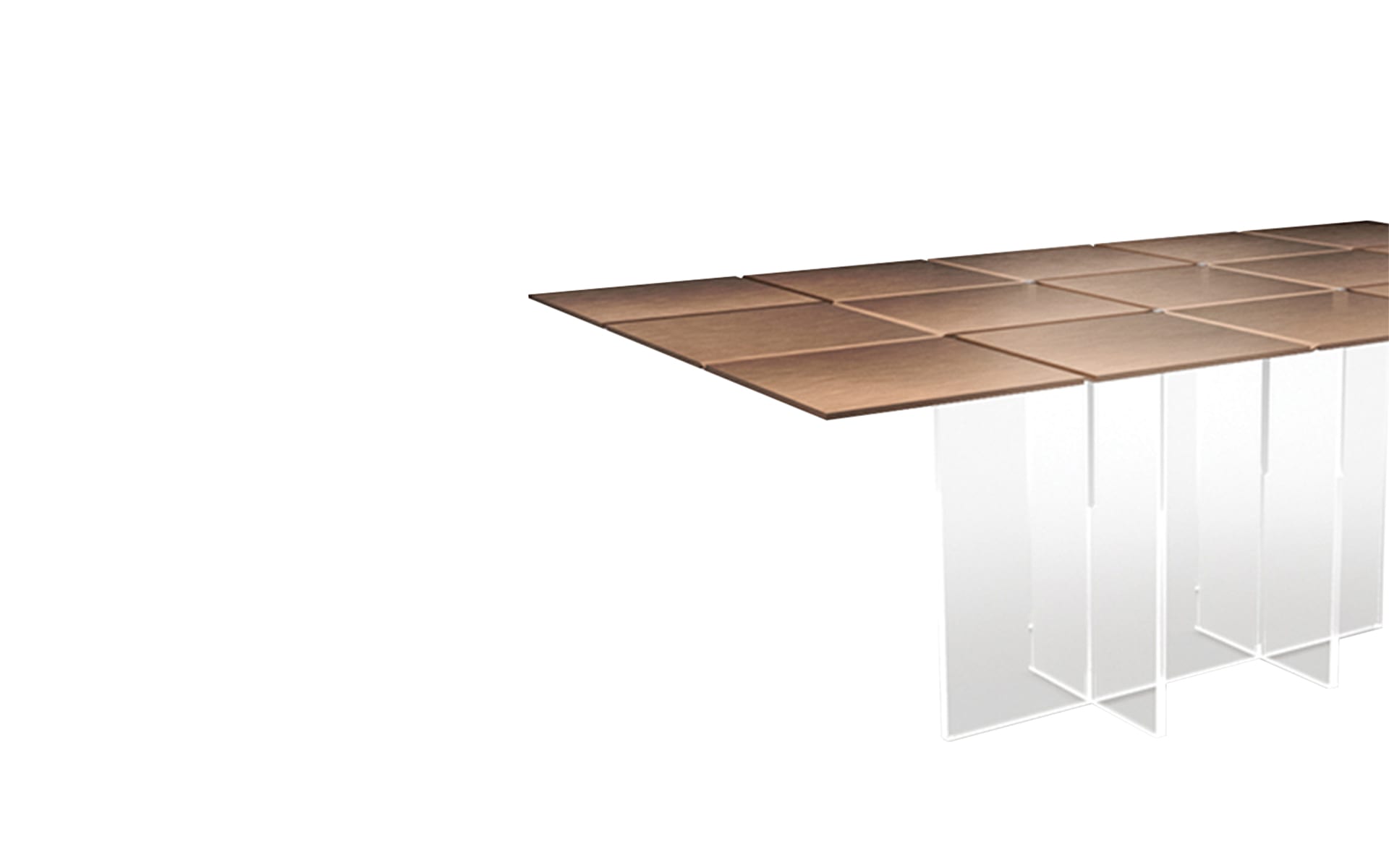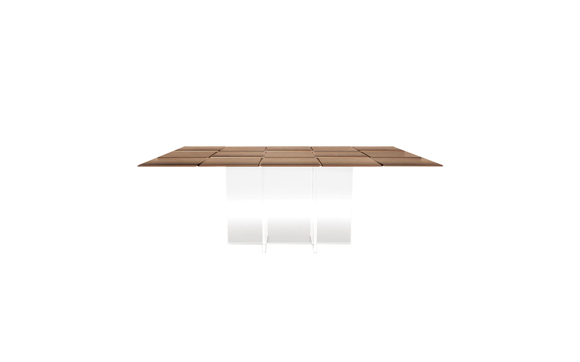 Clear acrylic legs lighten the whole silhouette. They let the top take the lead, while the base almost disappears from certain angles. And that contrast—solid grid above, transparent support below—gives the table its quiet edge.