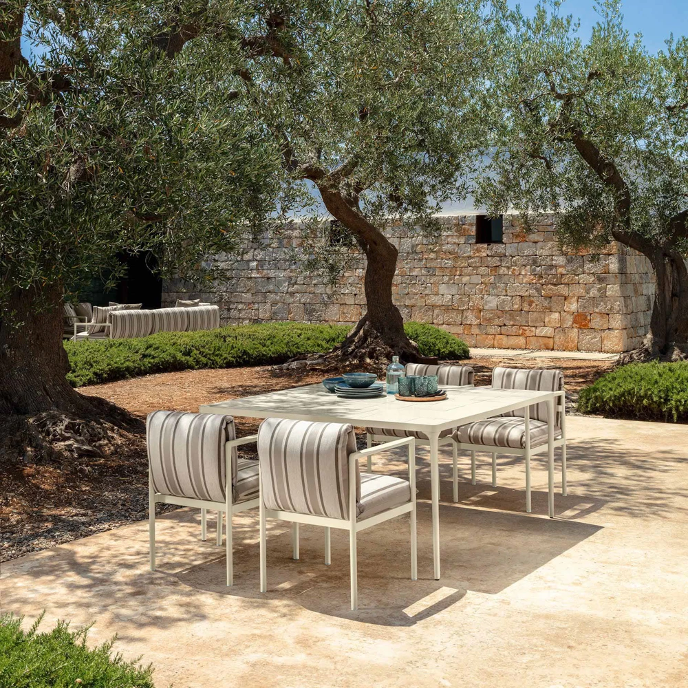 The Talenti Nalu Dining Table, conceived by Ludovica Serafini and Roberto Palomba, brings a composed, architectural presence to outdoor dining. Its profile is clean and confident, with a generous square top that invites people to gather without cluttering the space. The mosaic surface subtly shifts with the light, adding quiet movement rather than flash.
