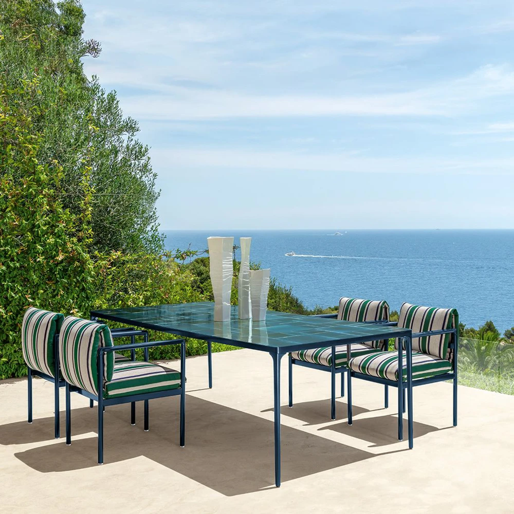 The top is a glazed stoneware mosaic—beautiful to the eye, smooth to the hand, and selected for open-air living. The frame is painted aluminum, lean and sturdy, with a refined, contemporary character. Available finishes include red, graphite, blue, and ivory-sand, making it easy to tune the mood from bold to understated.