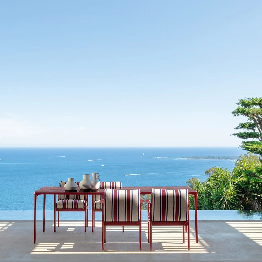 Nalu works on a city balcony, a coastal patio, or a private garden with equal ease. It also feels at home in hospitality settings where design needs to look considered from morning to night. Choose graphite for quiet sophistication, blue for a crisp accent, red for a confident focal point, or ivory-sand for a calm, natural read. Pair it with streamlined seating or mix textures around it—the table holds the composition together.