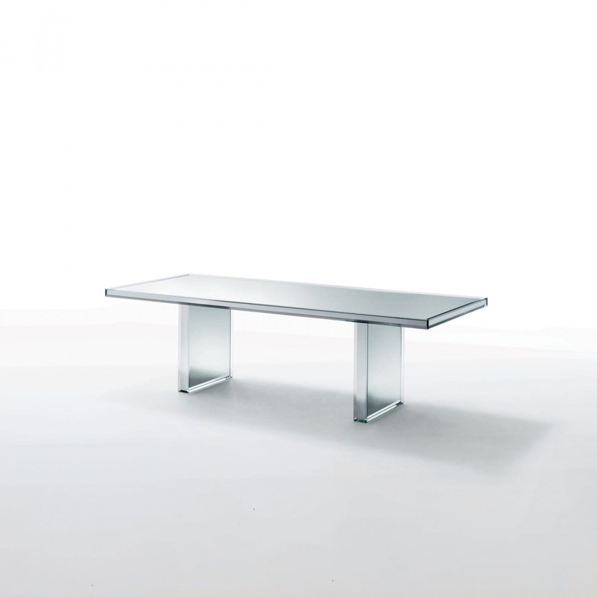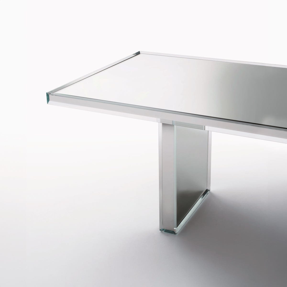 Prism Mirror tavolo reads like a simple rectangle at first glance. Then the room starts moving across it. The mirrored surface catches light, walls, and people, and it does it with a crisp, controlled shine. And because the top is transparent extralight glass with silver plating, the reflections feel clean rather than heavy.
