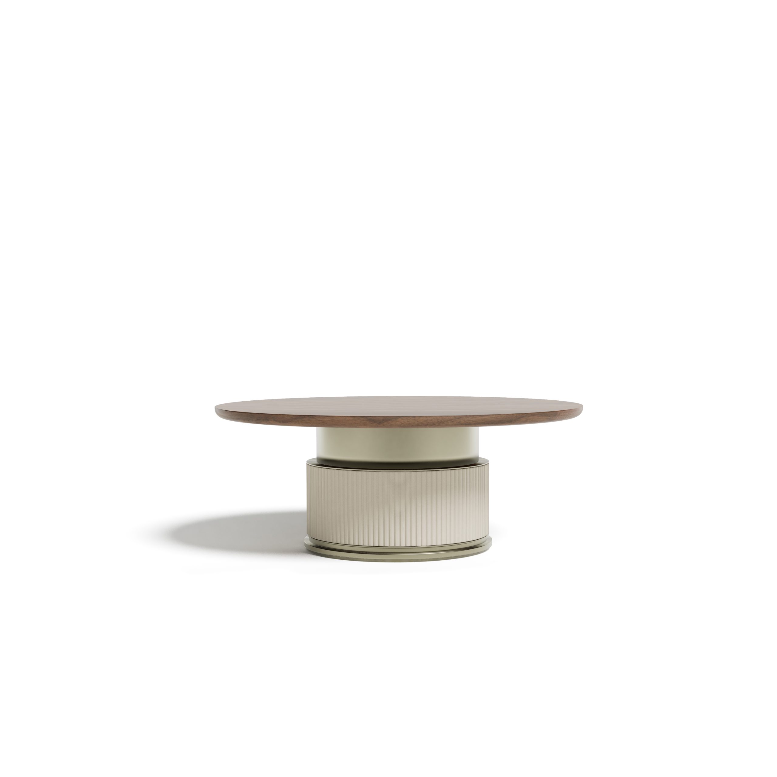 Nothing is ornamental for its own sake. The proportions feel deliberate: the base visually grounds the piece, while the top seems to hover just enough to keep it light. It works in spaces that favor clean geometry but still want warmth and texture at the center of the room.