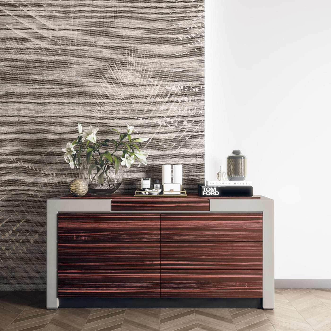 Smooth leather wraps the sides, adding texture without fuss. That mix of materials feels considered, not decorative for its own sake. At roughly 302 pounds, the chest has a reassuring solidity. It stands firm, not fragile, and has the presence of a serious, permanent piece of furniture.