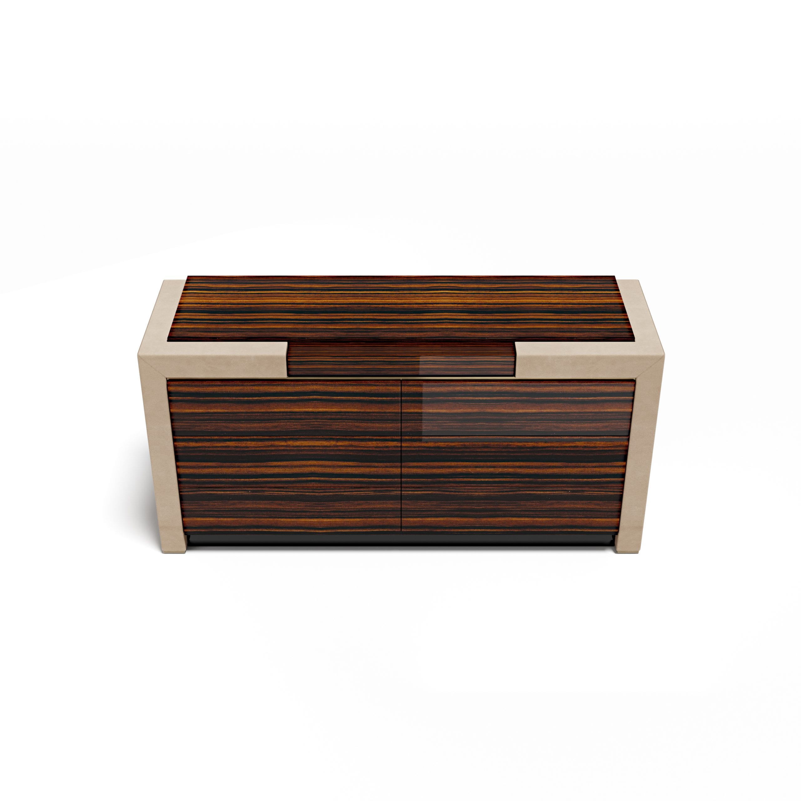 The mix of wood and leather adapts easily to different interiors. In a minimal room, it reads as a single, clean volume. In a richer setting, the leather sides quietly echo other upholstered pieces.