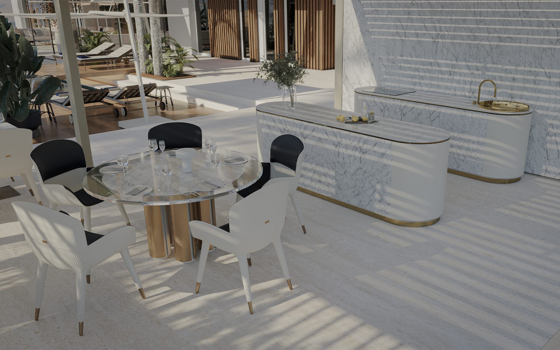 Moon Kitchen fits naturally on a terrace, by a pool, or under a covered patio. It brings a quiet sense of order to open-air living, and it pairs well with different outdoor dining styles, from minimal to more layered looks. It’s also offered in a variety of finishes and accessories, so it can lean more architectural or more warm, depending on the space.