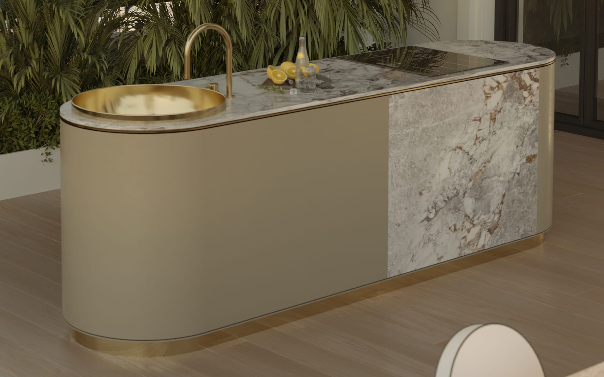 The standard version of Moon Kitchen pairs a Dekton stone top with plated stainless-steel metallic details and a lacquered fiberglass structure. The combination reads modern, but it also makes sense for an outdoor environment where surfaces need to stay composed and easy to live with. Myface keeps the material story straightforward, with contrasts that feel deliberate rather than decorative.