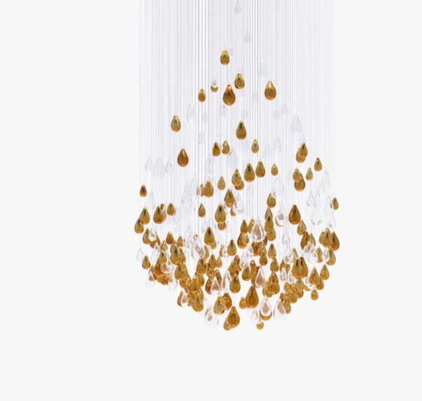 As a lighting sculpture, it sets a mood rather than chasing output. The gold glass lends a soft warmth; reflections fold across the metal and nearby surfaces. The density gradient deepens the sense of volume, so light seems to hover in layers. In quiet rooms it brings a gentle glow. In active spaces it adds rhythm and a point of calm.