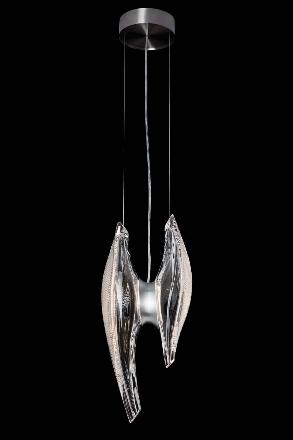 Crafted in clear crystal glass with a transparent anodized aluminum alloy frame, the pendant balances visual lightness with physical presence. The handmade glass carries delicate striations and may include small bubbles—natural signatures of the process that add depth to the surface. At approximately 24.6 inches high, 10.2 inches long, and 8.1 inches wide, it holds a confident profile without overwhelming the setting. Weight is about 22 pounds, giving reassuring stability once installed. Lasvit offers this design in a single, base-size silhouette that preserves the intent of the original form.