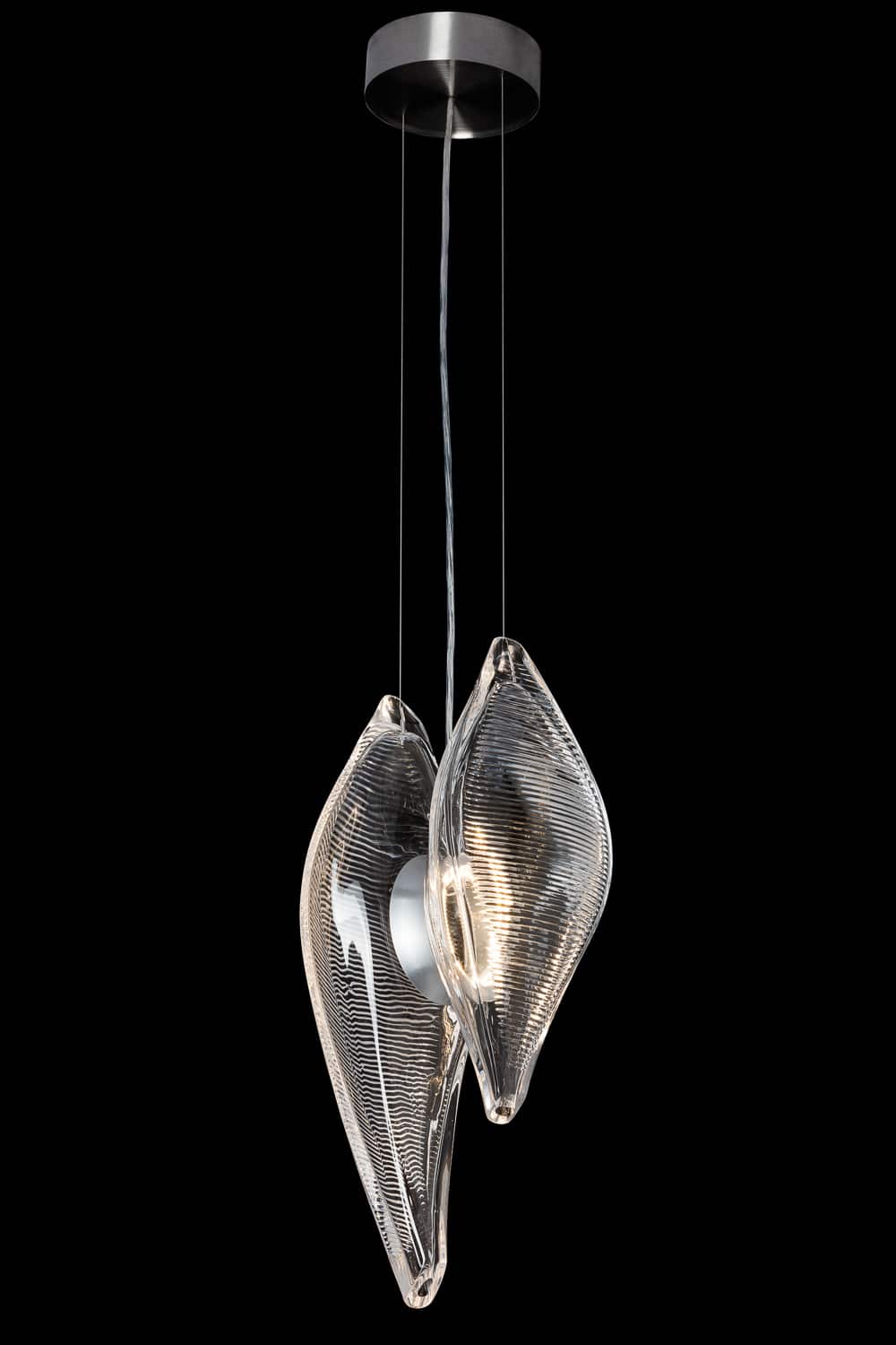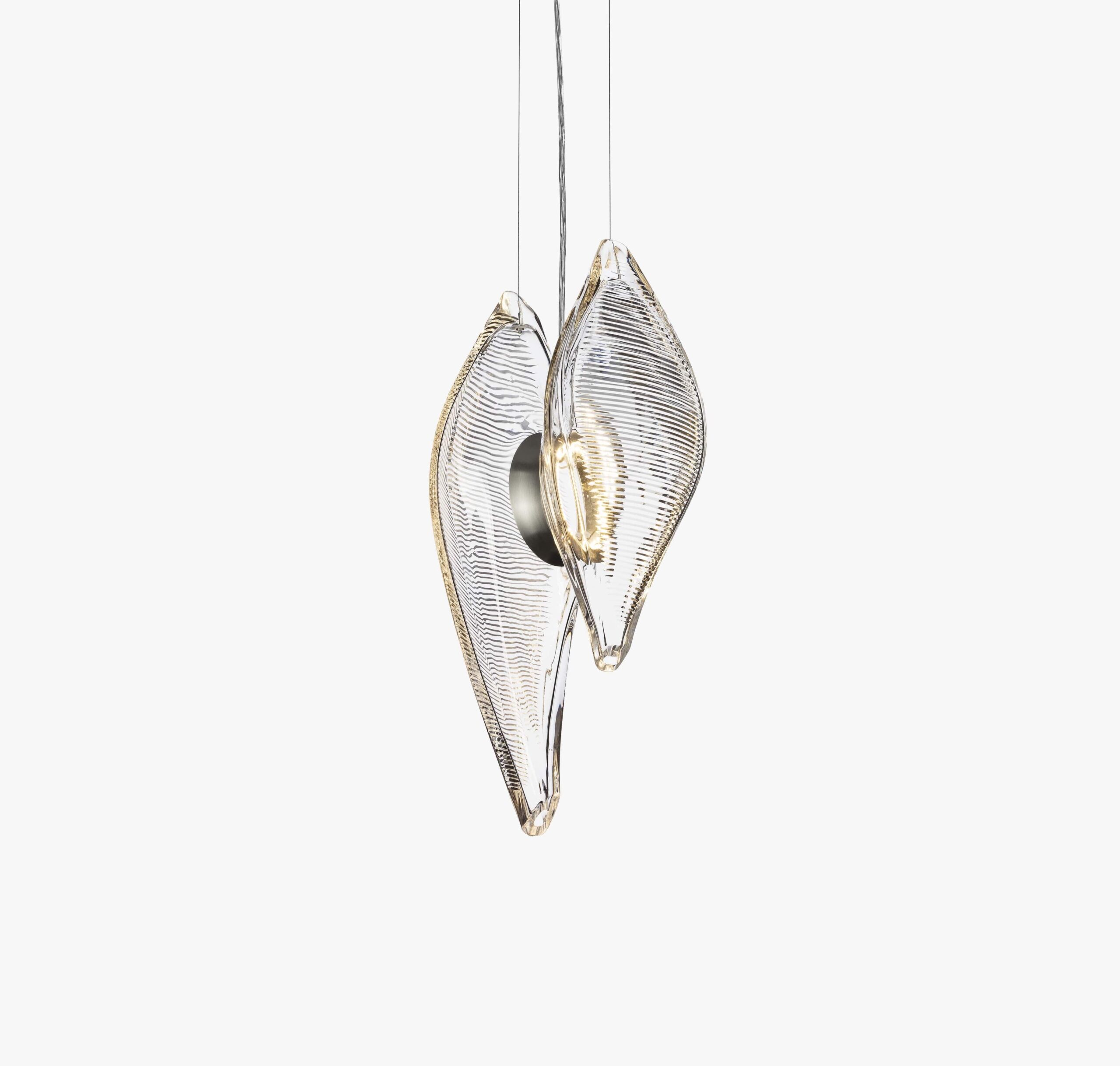 The Duna Base Size Pendant takes its cue from dune formations, where order and irregularity live side by side. Two asymmetrical glass volumes intersect to create a single, three‑dimensional silhouette that feels fluid from every angle. The striated surface works like a quiet topography, catching light, shifting tone, and revealing subtle details as the viewer moves. It is sculpted but not showy. And it reads differently by day and by night, which keeps the piece engaging without trying too hard.